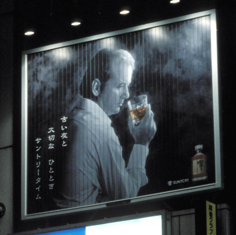 分享本圖看著鮑勃拿著一杯響 17 年(HIBIKI 17 year old)坐在椅子上,一遍遍僵硬的說著 ”For relaxing time, make it Suntory time.“ 實在是讓人印象深刻,也貼切詮釋了鮑伯缺乏新意與過氣。 然而這一幕或許也讓有些人覺得似曾相識,因為一直以來,確實有許多好萊塢影星曾為日本威士忌打廣告,像是奧森威爾斯(Orson Welles)和基努李維( Keanu Reeves)。1980 年,導演蘇菲亞・柯波拉( Sofia Coppola)的父親,同時為電影《教父》的導演法蘭西斯・柯波拉( Francis Ford Coppola)也與日本導演黑澤明合作拍過三多利威士忌的廣告。