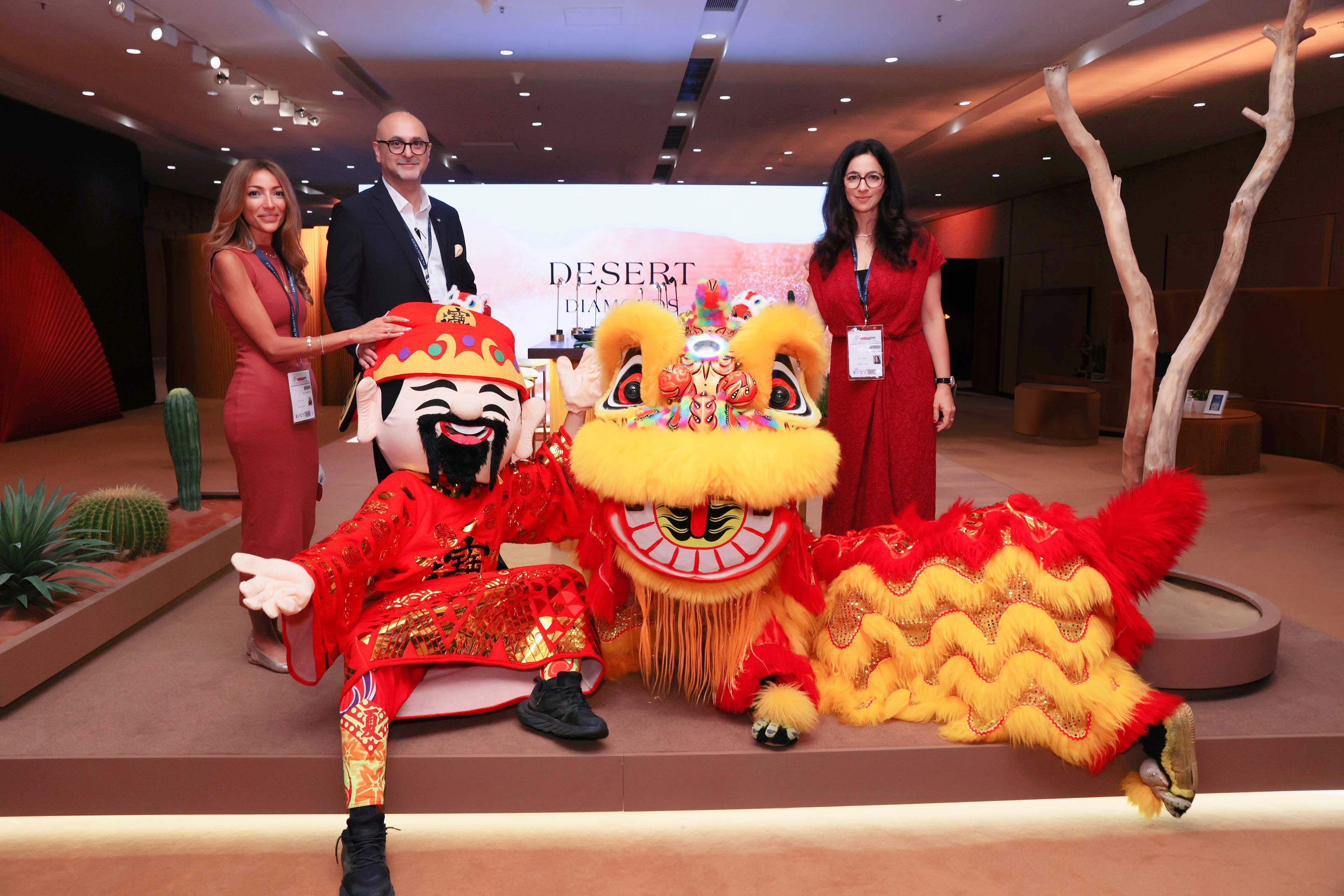 De Beers 集團首席貿易與產業長 Feriel Zerouki(左一)、首席商務官、成品鑽石高級副總裁 Mahiar Borhanjoo(左二)和天然鑽石總經理 Lynn Serfaty 共同為舞獅點睛,開啟 De Beers 集團 Show & Tell 空間。(圖/De Beers 提供)