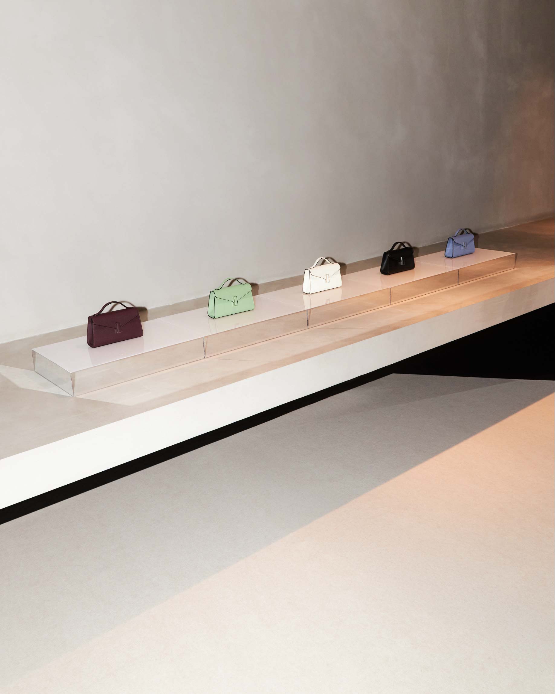 全新系列「 Anatomy : A Study of Movement 」在米蘭 Via Manzoni 旗艦店登場。展區空間化為遊走於工藝與實驗精神的實驗室:燈箱突顯材質的多維層次,鏡面折射皮件的完美對稱,厚實的單色地毯呼應 Iside 包款的結構元素,營造兼具視覺與觸覺的沉浸體驗。現場也展出三件藝術裝置,探討品牌經典元素的結構美學。