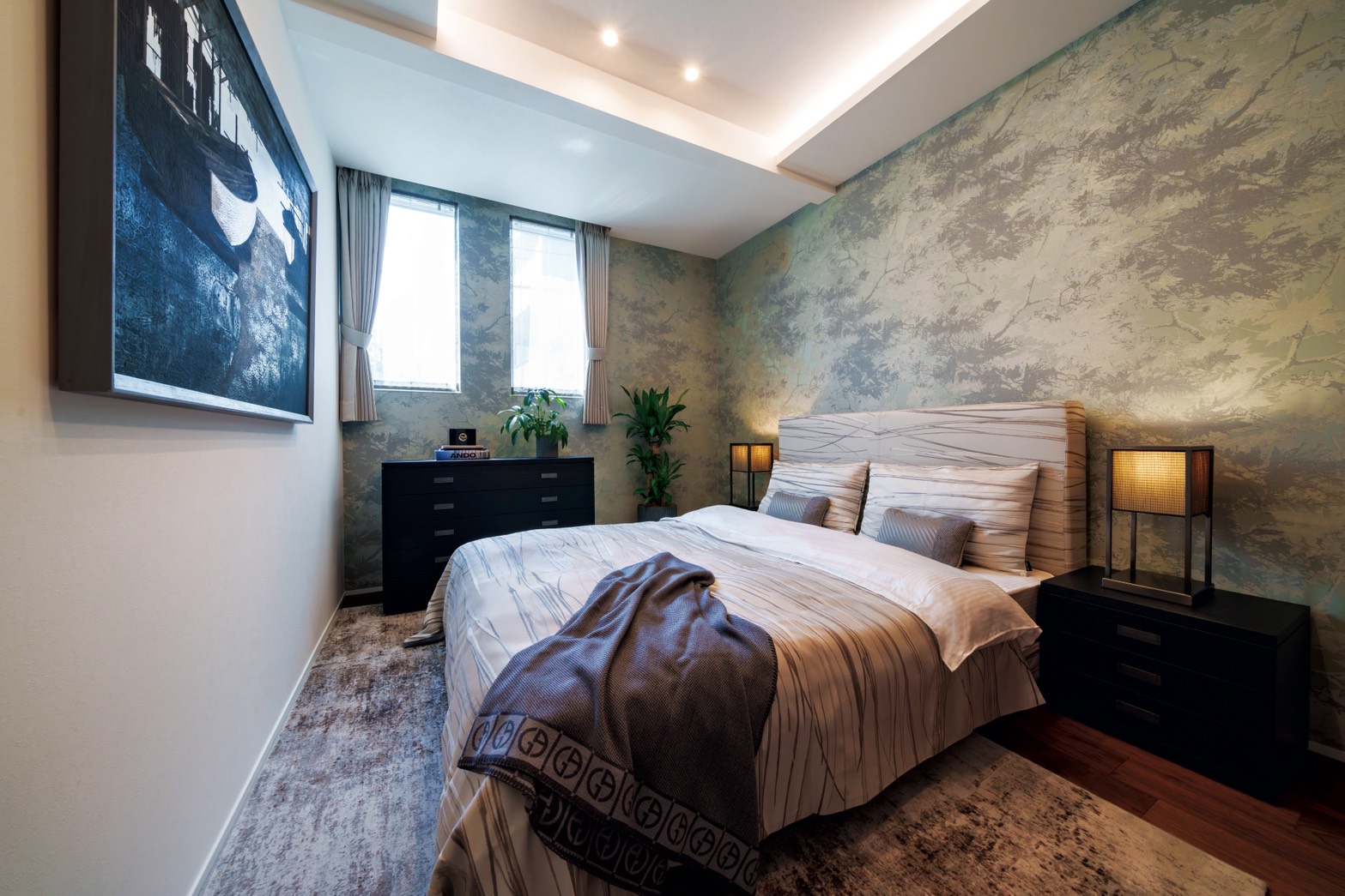 主臥室的亮點是採用「Basho 壁紙」,靈感來自日本山巒的抽象設計,完美融入日式自然元素,讓人感受到品牌對日本文化的深深致敬。負責項目的資深製作人井上翔太表示:「 ARMANI / CASA 將松、竹、山等東方元素融入設計,細節處處展現對日本文化的尊重,打造出安靜而私密的奢華空間。」