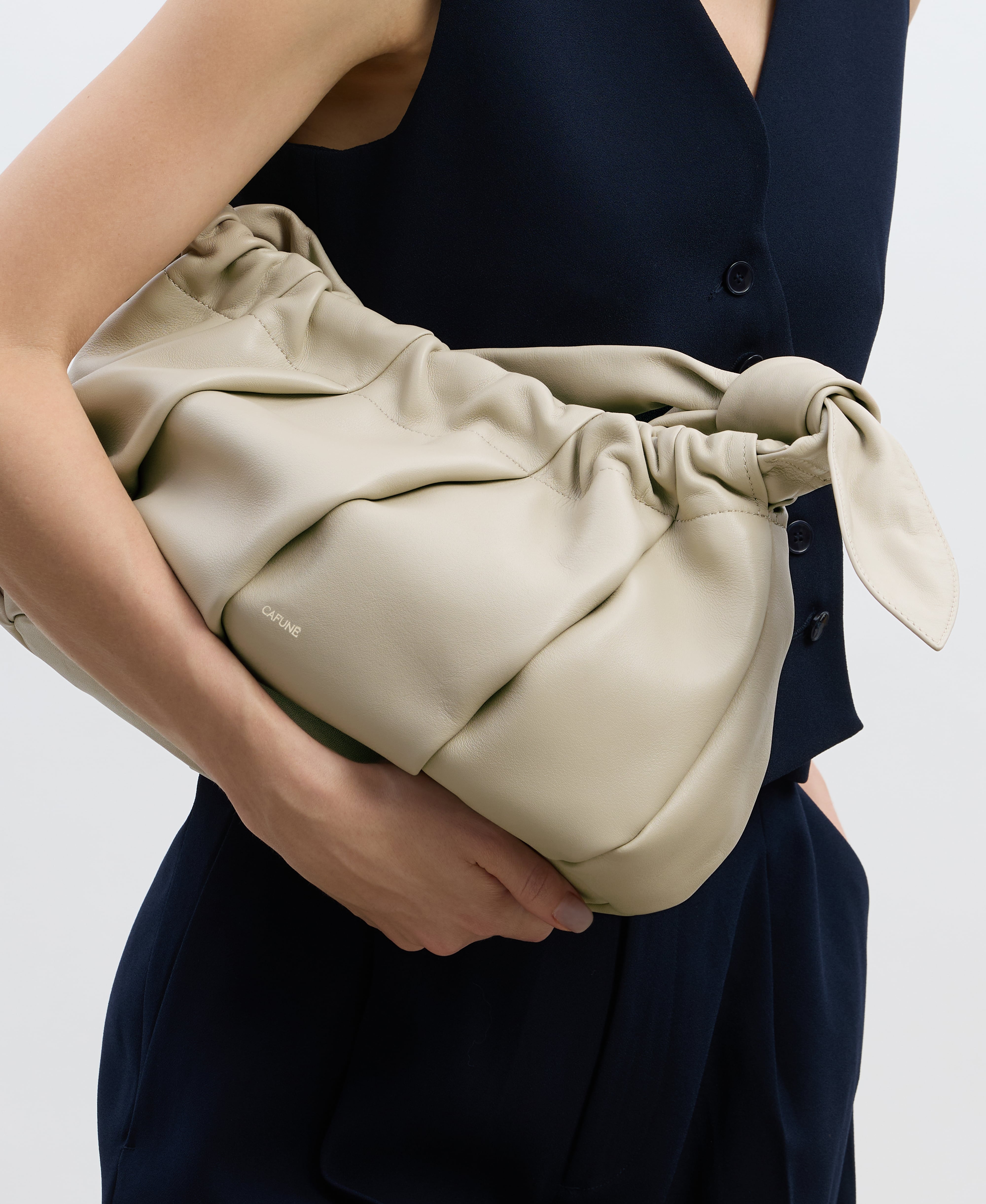 Soft Fold Bag 系列靈感來自貝殼的形態與靜謐力量,象徵現代女性的多元樣貌。每個包款形狀、紋理獨特,呼應女性個人故事。包款採用柔軟納帕皮革,輪廓隨使用自然收放,呈現慵懶而優雅的線條。葉形繩結延續品牌語言,肩帶可自由調節,兼具休閒與精緻感。提供黑色與燕麥白兩款,適合日常或特別場合使用。