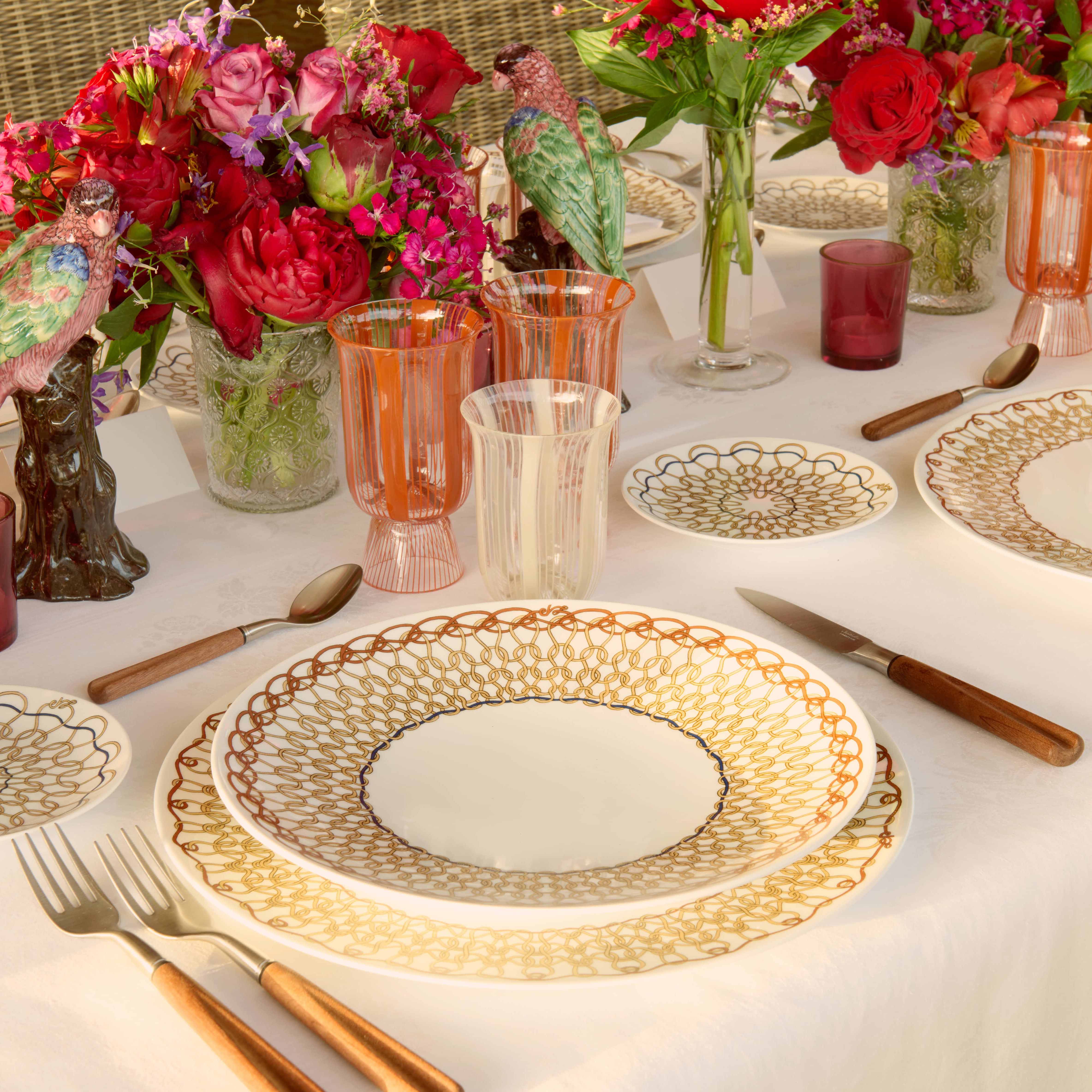 每件 Punti a Maglia 餐具均由法國利摩日的資深工匠精心打造,遵循最嚴謹的傳統製瓷工藝。餐具表面精巧描繪出米粒針、平針及花式針等針法圖案,並以杏色、kummel 色、海軍藍、酒紅及赭色線條交織,細膩呈現 Loro Piana 針織品的高雅工藝。這些紋飾不僅呼應品牌的紡織傳統,也讓餐具本身成為藝術品般的焦點。