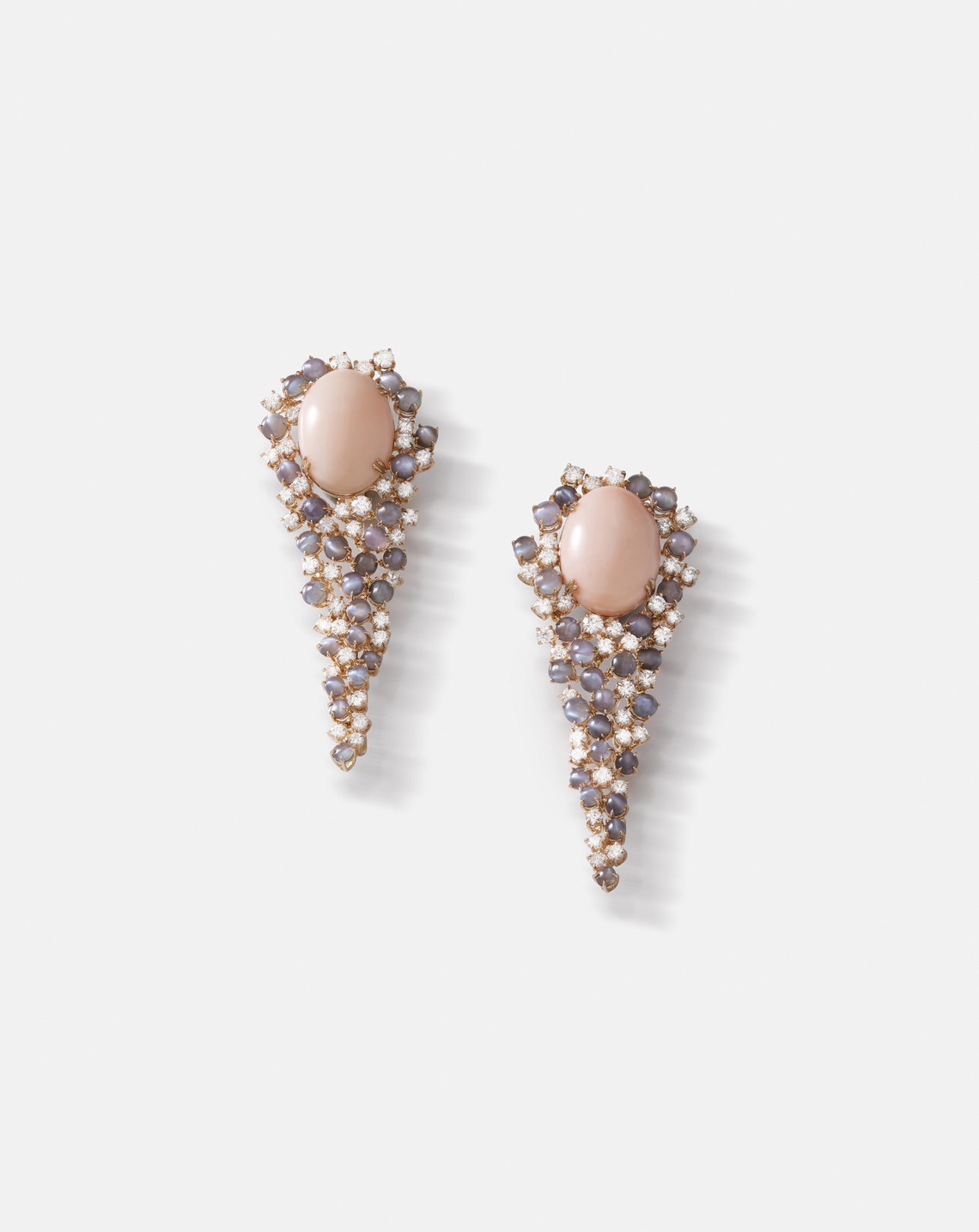 分享本圖Specchio della Notte乃「夜之鏡影」之意,靈感來自義大利湖泊的暮色時分,當天空與湖面相互映照,萬籟俱寂中展現出深邃的光之平衡。此系列以柔粉珊瑚與貓眼石捕捉那份黃昏的靜謐詩意。