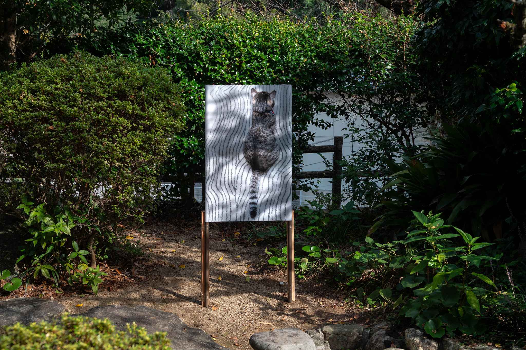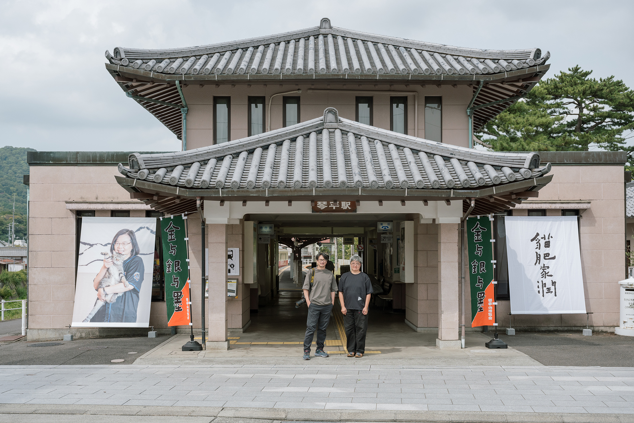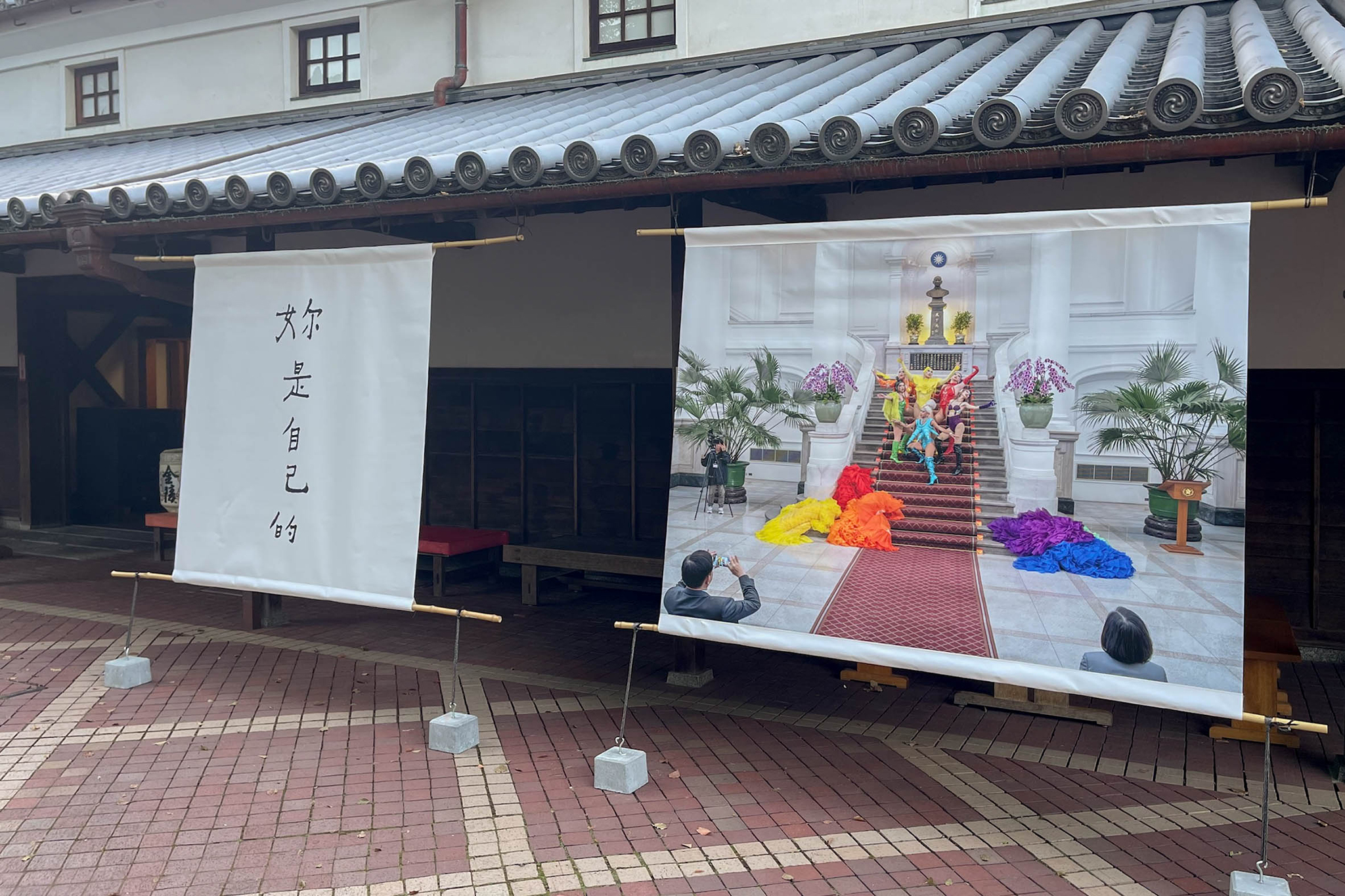 何景窗的書法筆觸溫潤、帶有流動感,與林育良的攝影形成對位。兩人當初以「辣台妹」為起點,將政治標語轉化為文化語言,讓影像重新回到觀看本身:「在日本展出的好處,是觀者不會先以政治去閱讀,而能從形式與情感切入。」林育良說,展覽的形式也延續他一貫的「開放式劇場」概念。琴平的車站、酒廠與寺院都被轉化為展示場域,觀者在行走中經驗作品;東京 SHIBAURA HOUSE 的透明建築,則象徵他在創作上追求的「通透」。在不同空間之間,攝影從紀錄變成了事件,觀眾的移動本身也成為展覽的一部分。