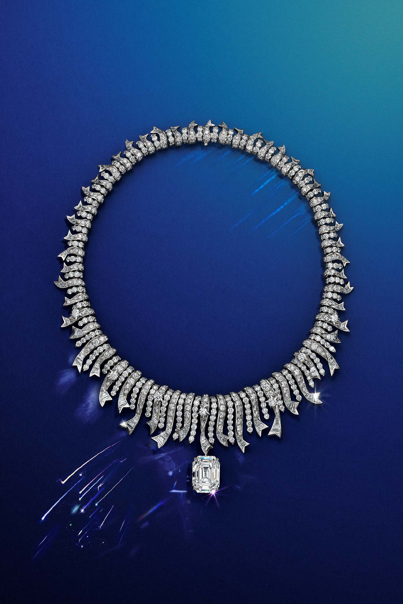 分享本圖同樣出自 Nathalie Verdeille 與 Tiffany & Co. 設計工作室的「 Shooting Star 」流星光彩項鍊,出自 Blue Book : Tiffany Céleste 高級珠寶系列。以飄逸的緞帶造型演繹流星劃破夜空的壯麗景象,呼應品牌的經典設計。