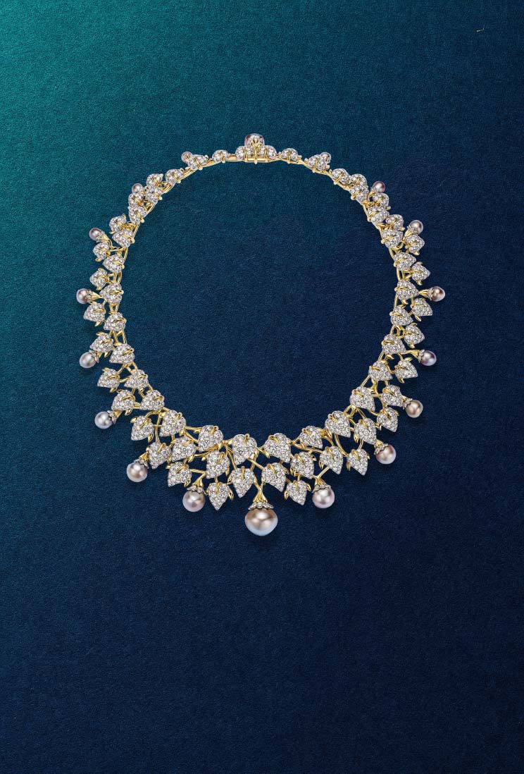 分享本圖「 Cascade 」項鍊以鉑金與 18K 黃金打造,由 Nathalie Verdeille 與 Tiffany & Co. 設計工作室聯手創作,靈感源自 Jean Schlumberger 經典的 Leaves 項鍊。鑲嵌 18 顆天然海水珍珠與 1,276 顆圓形明亮式切割鑽石,流動的金色藤蔓與光澤柔潤的珍珠交織出大自然的詩意之美。