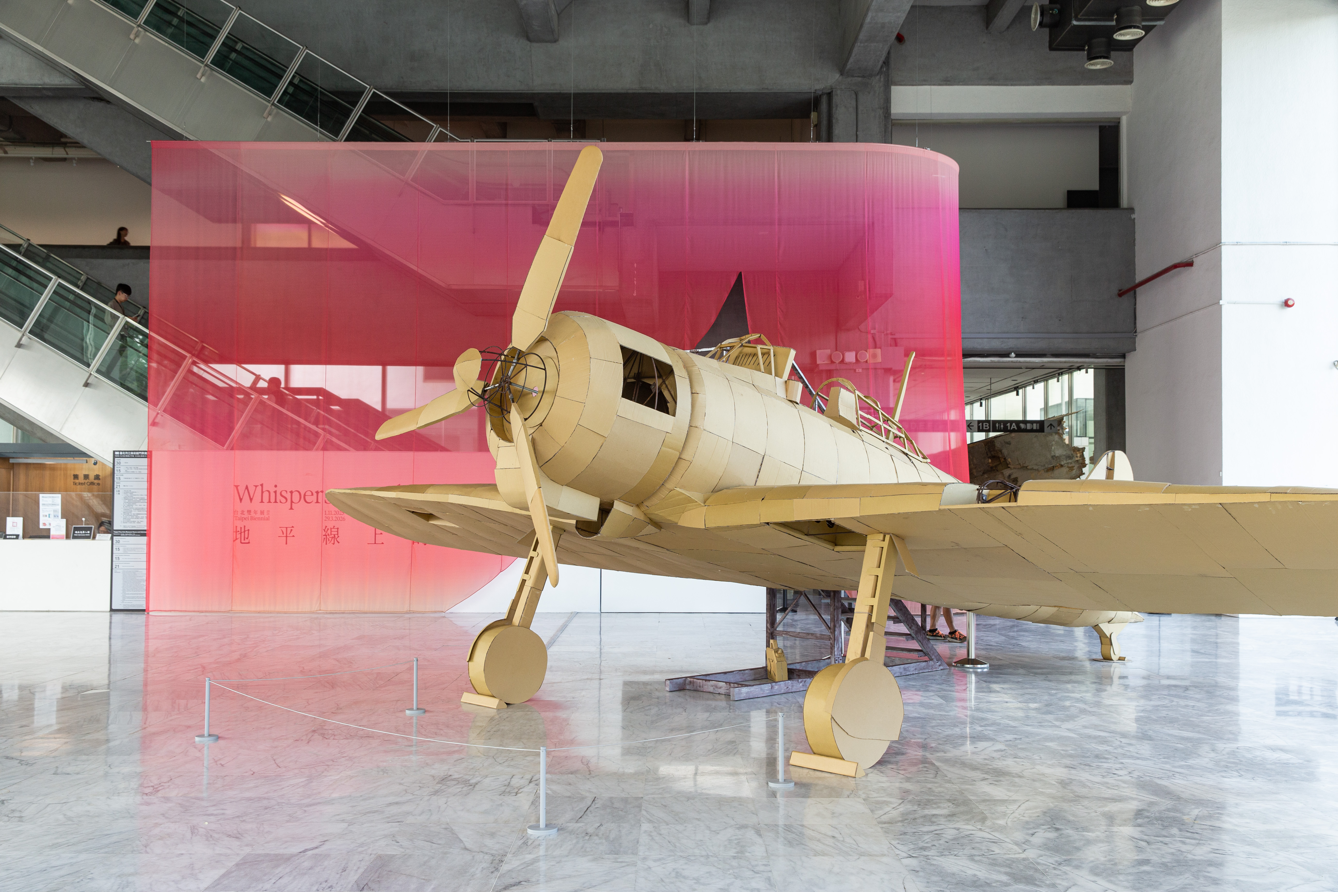 邱子晏,《偽飛行場》(局部),2025,零式戰鬥機複製品搭配顯示器、影片、碉堡造型之音聲座椅,15 分鐘,1200 × 900 × 300公分,120 × 45 × 40公分,藝術家提供,由 2025 台北雙年展及國家文化藝術基金會委託製作。(圖/臺北市立美術館 提供)