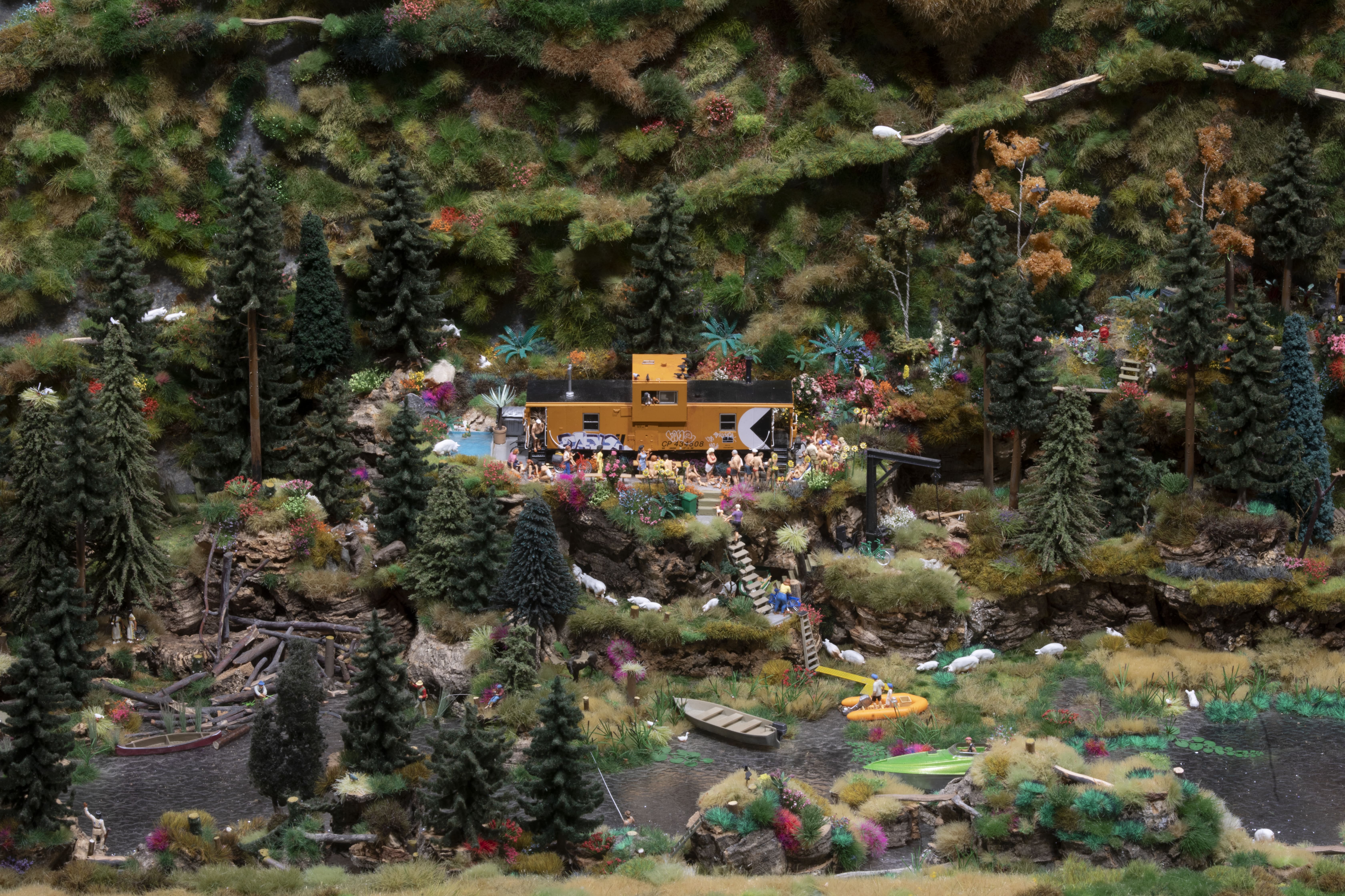 金·亞當斯,《抵達》(原名《豬山》),2014-2025年,HO 1/87 比例微縮模型、人造石、軟木樹皮、粉末顏料。藝術家和亨特畫廊惠允。(圖/上海當代藝術博物館 提供)