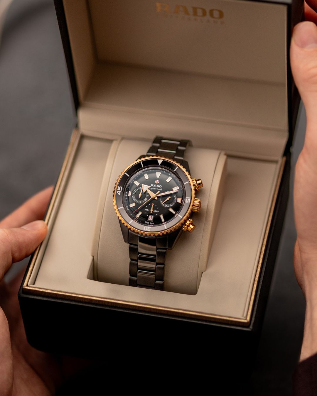 分享本圖在阿爾卑斯山脈的深處, Captain Cook 庫克船長高科技陶瓷計時碼錶就像藏在金色洞窟裡的寶藏。這片猶如星辰熔煉而成的原始空間,襯托出時計現代而大膽的風格。黑色高科技陶瓷錶殼結合霧面與拋光質感,層次分明,而細緻的玫瑰金色點綴宛如夜空中的星光。錶內搭載 Rado 瑞士雷達表 R801 自動機芯,具備計時功能與長達 59 小時的動力儲存,這款腕錶不只展現風格,更把功能與美學完美結合,為每一段珍貴的節慶時刻增添亮眼光彩。