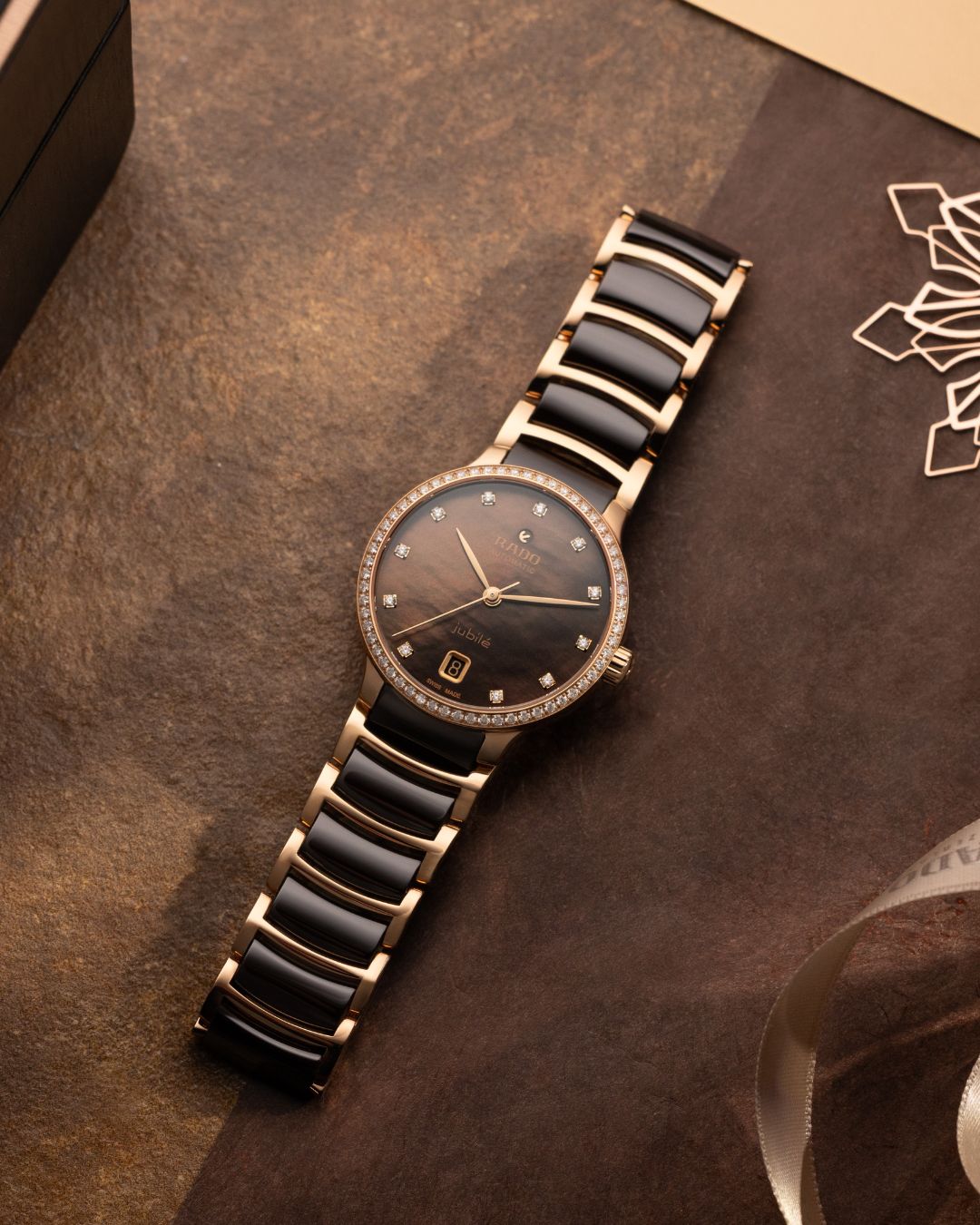 分享本圖鑲鑽腕錶讓人彷彿步入一座純粹優雅與奢華交織的殿堂。穿越閃爍的圓形門廊,鑲嵌著 71 顆頂級威塞爾頓足瓣切割鑽石的錶圈,就像星光點綴的閃耀沙漠。棕色珍珠母貝錶盤散發自然溫潤的光澤,與玫瑰金色錶鏈搭配拋光棕色高科技陶瓷中間鏈節,完美平衡華麗與細膩。小巧而精緻,展現品牌對工藝與美學的極致追求,更是節慶送禮中最適合的選擇。