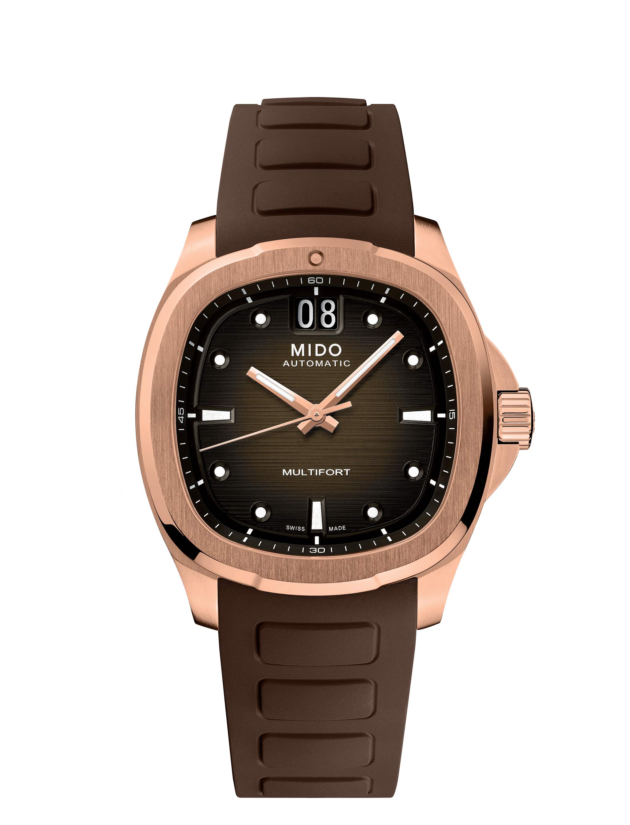 分享本圖溫暖氛圍中的閃光,在慶祝時刻更顯動人玫瑰金與巧克力棕色交織出濃厚的節日氣息,水平拉絲的錶盤在光線下展現迷人的流動層次,從中心的暖棕漸變到外圈深黑,像節慶夜晚的燈火被微風輕輕撩亮。 Multifort TV Big Date 獨特的 TV 造型搭配 12 點方向的大日期窗,使每一個值得紀念的瞬間,都被柔光烘托得更為動人。白色夜光時標與指針在暗處綻放溫柔光芒,讀時清晰而沉穩;搭載 Caliber 80 機芯,提供長達 80 小時動力儲存,為忙碌節慶裡的每個重要時刻注入堅實節奏。在這個充滿期待與祝福的季節,它以迷人的色彩與穩定的力量,陪你捕捉那些不可錯過的節慶亮點。