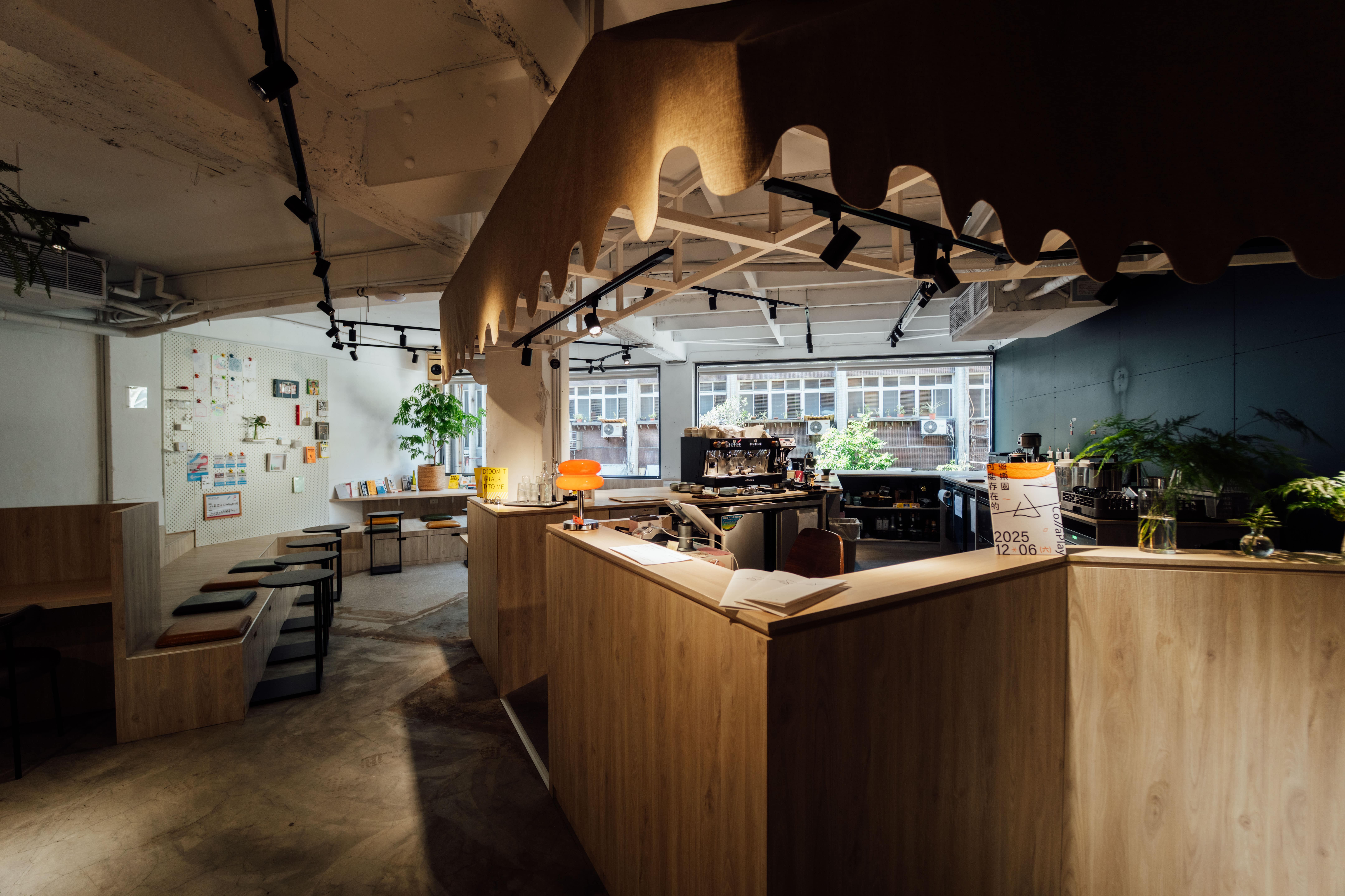 3F「頻率交流道」為咖啡廳與動區工作空間,以大量木質及工作檯、階梯式設計包覆,將場域線條延伸為 45 度角,營造空間錯置的趣味感,更便於大家相互討論、激盪想法。(圖/CollaPlay 可能存在的遊樂園 提供)