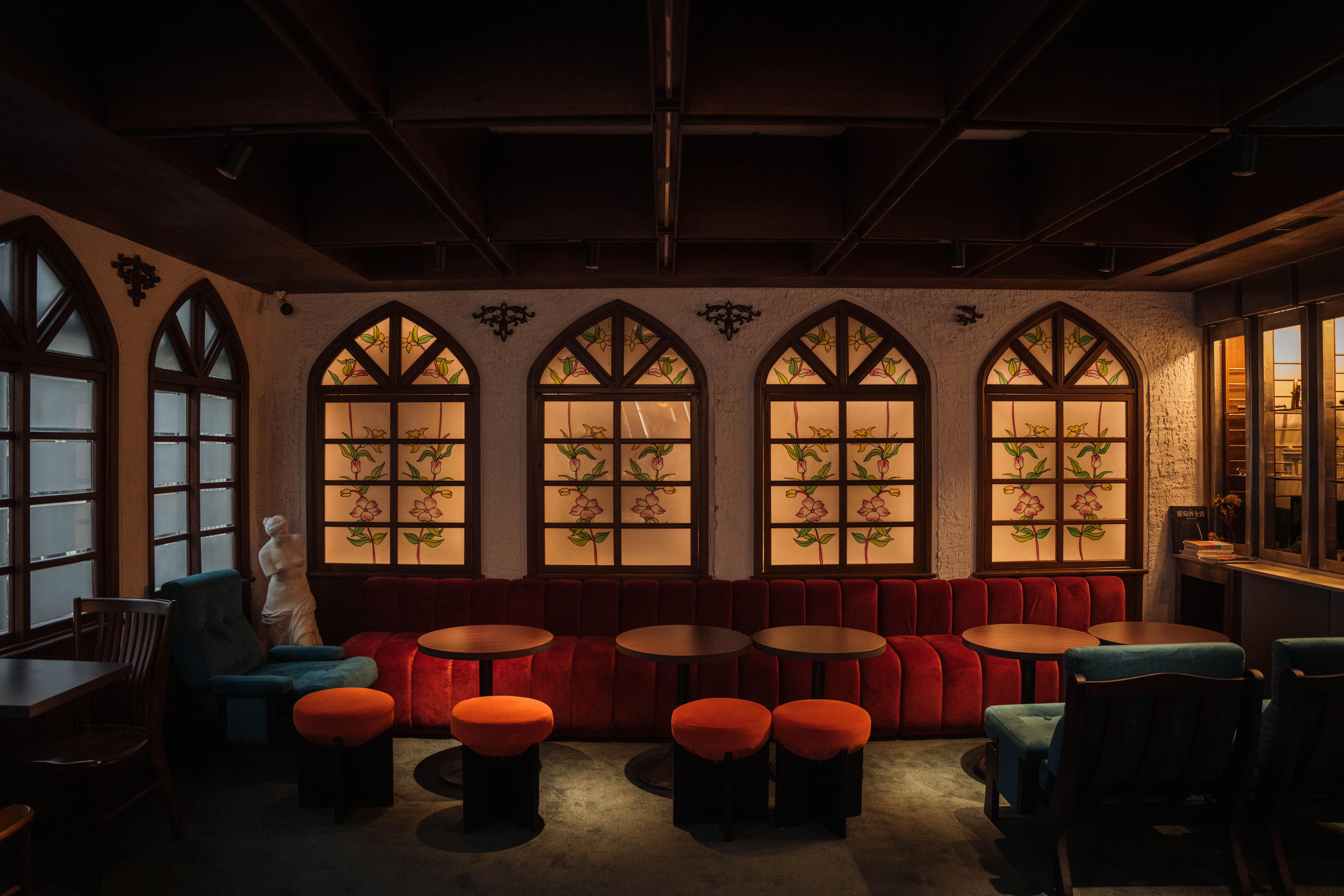 時光彷彿凝結在這個過去曾為 Raymond 祖父辦公客廳的所在處,天花板仍隱約透出檜木氣息,延續著家族經營半世紀來的腕錶事業軌跡,繼續以「時間」為核心,延續場域生命。走到酒吧裡面便能感受到與剛才提到的場域是全然不同的風格,這裡神秘之中卻帶有時間的沈穩。