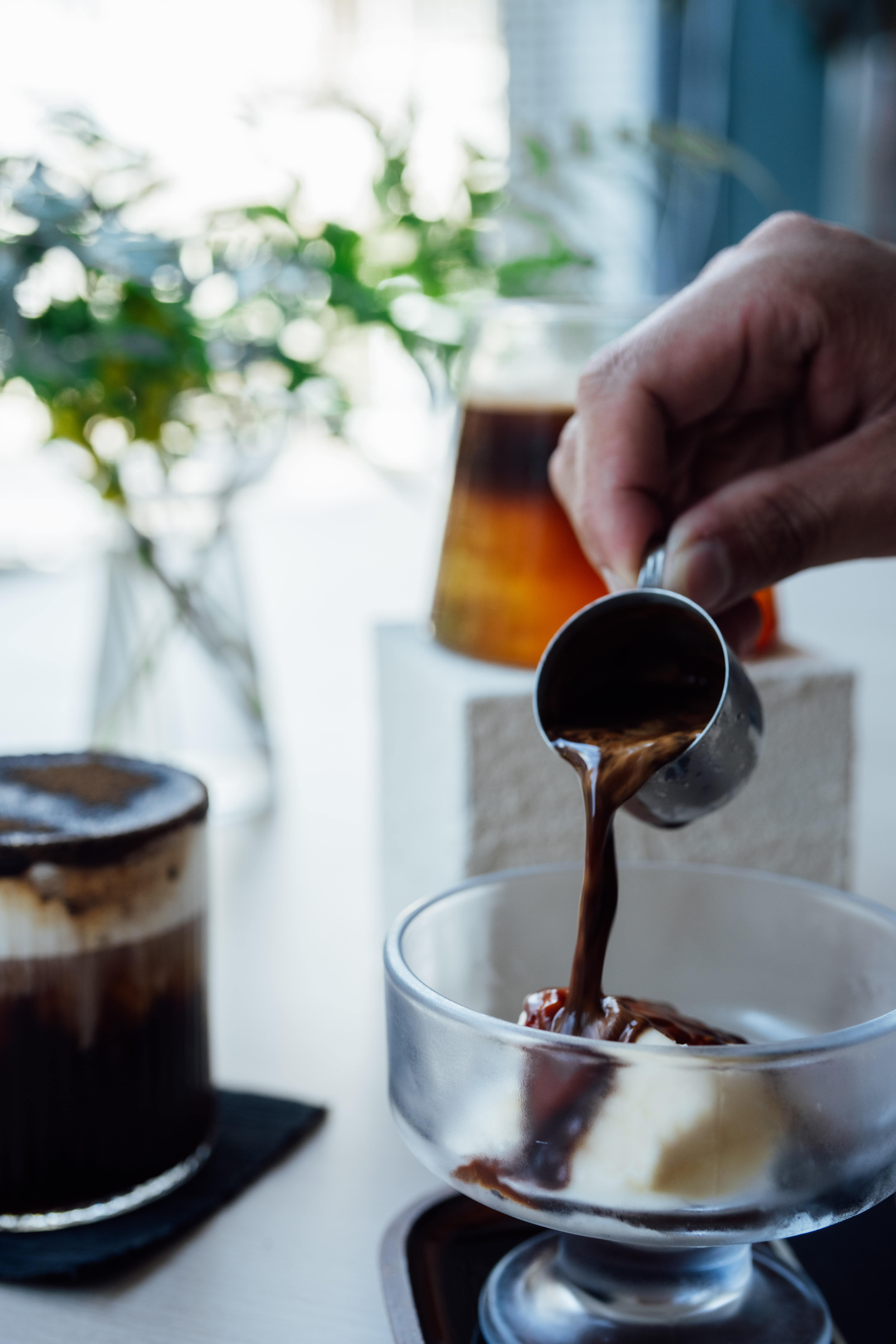 CollaPlay 咖啡廳特別推出「樂園特調」,左、中、右分別為:圍兜兜(焙茶厚奶美式)、輕重的哲學(椰子美式)、淹沒的過程(阿芙佳朵)。(圖/CollaPlay 可能存在的遊樂園 提供)