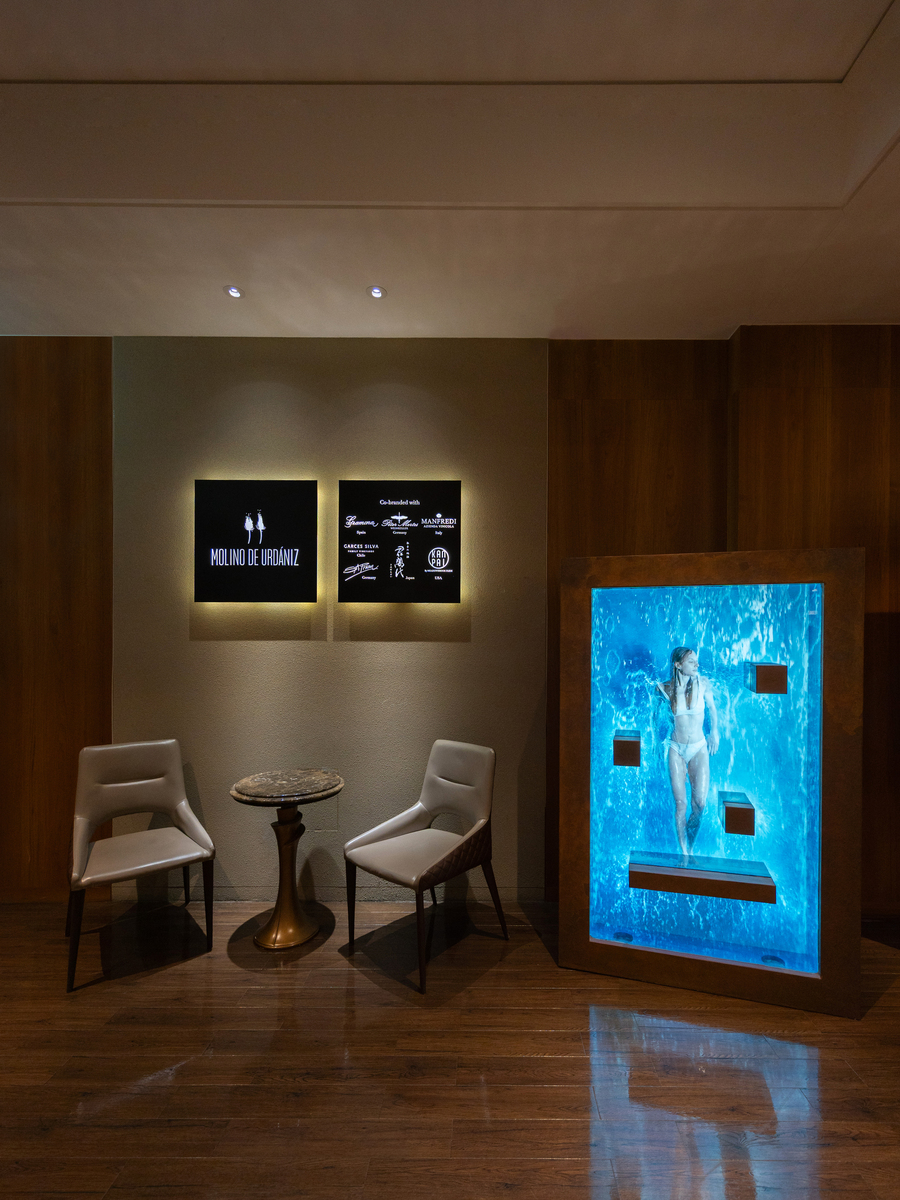 中午時分,走出捷運站便感受到寒冷的微風吹過,意識到冬日已到,跟隨著導航,來到今天的目的地慕舍酒店,參與一場藝術與美食的雙重對話。走入酒店中,電梯出來,一個有趣的互動式藝術品頓時將我吸引住,便是藝術家 Marck 馬克的作品《 Waterfall 》,木質的畫框、深藍的流動的水、作品中移動的女子。看見第一眼,有如被困在木箱裡的女子,但仔細觀察,在瀑布的水流下,她從蹲下到站起,雙手舉起,宛如在抵抗著瀑布強大的水流,帶出強大的衝擊感,同時也引領人們去探索,想像其中的意義。