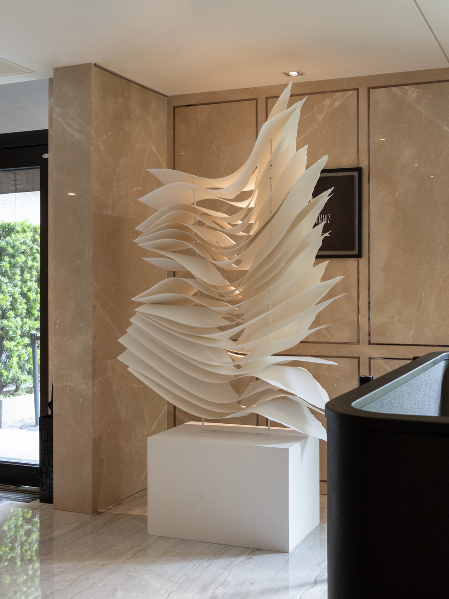 分享本圖伴隨著王薇薇的話語,用餐進入尾聲,即將進入探索展覽的正題。從慕舍酒店的一樓開啟這場藝術之旅,沿著門口擺放五顏六色棒棒糖,強納森 • 保羅的《 Mini Meltdown 》,再到面對入口牆上擺放約瑟普 • 里埃拉 • 伊 • 阿拉貢的《White wing airplane on boat》,象徵著對生命、旅行、方向的探索。接著轉彎到安格拉 • 格拉札《Montcanus》以 400g 單色的工業紙張堆疊而成,帶出時而動態,時而靜態之感,象徵地殼能量於瞬間爆發的原始力量。