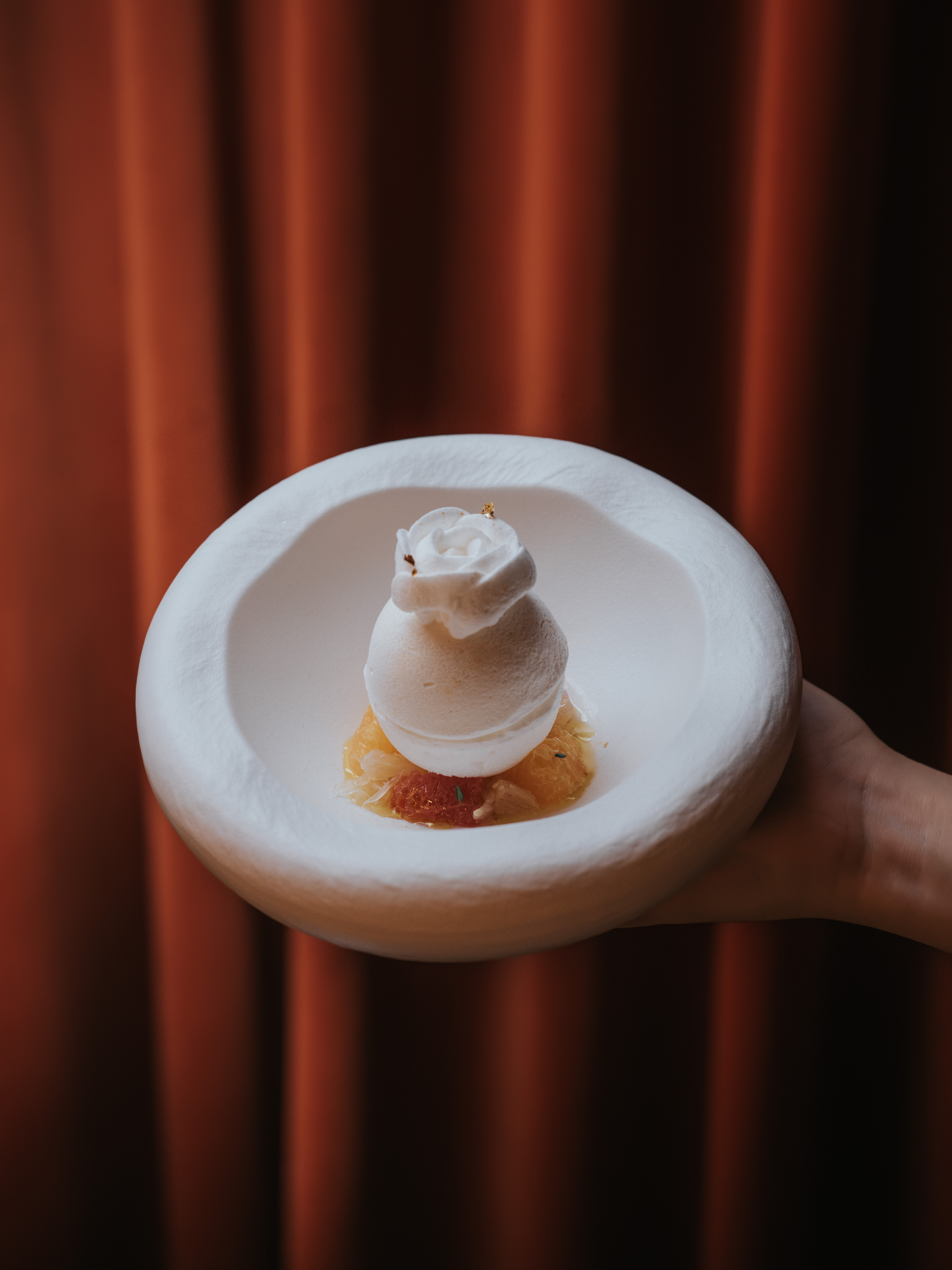 分享本圖最後一道〈餘音的爆發〉談的則是力道。最初的構想更為「激進」,但最終選擇收斂形式,把衝擊留在風味裡:綜合香草與辣椒製成雪酪,搭配柑橘系輪廓,入口乾淨俐落,隨後辣度明確浮現。這一道的「儀式感」來自於破壞,那一個「壓碎」的動作不是高潮,而是那一下已經結束,卻仍停留在感官裡的痕跡。