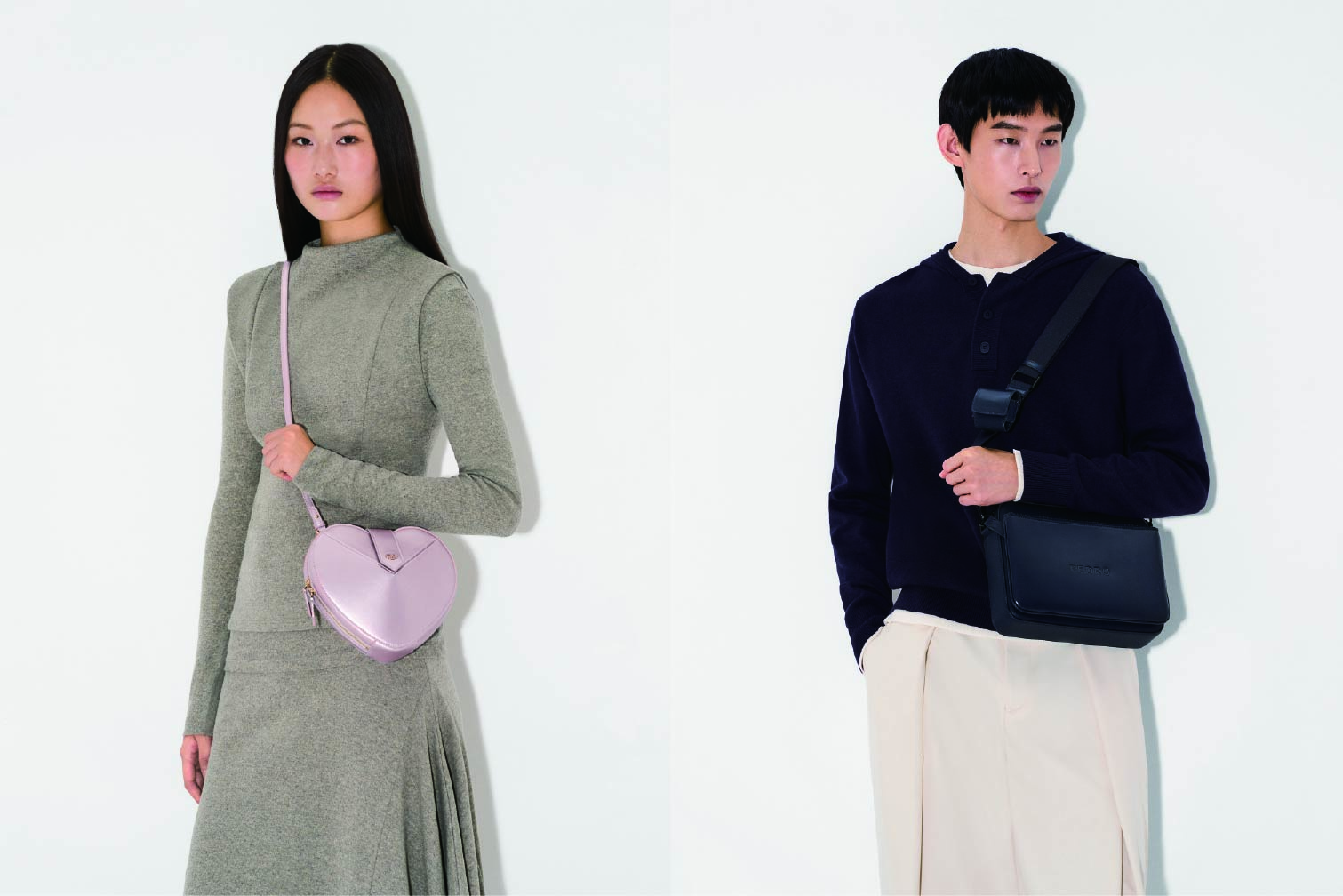 分享本圖粉色浪漫穿搭,以同色系與反差混搭作為核心,透過材質、輪廓和色彩,展現出專屬於都會戀人的默契感。女仕的整體造型以粉色為主,造型感十足的心形肩包和以壓紋小牛皮製成的 Dana 皮革水桶包,既俐落又帶有溫暖的都會氣質。鞋子則搭配低跟的 Maggie 皮革後空高跟鞋,展現精緻的從容優雅感。男仕的造型則以內斂的俐落感平衡整體氛圍, Travis 斜挎包搭配結合厚底與經典便士鞋設計的 Wyatt 皮革樂福鞋,讓正式和休閒完美地融合。