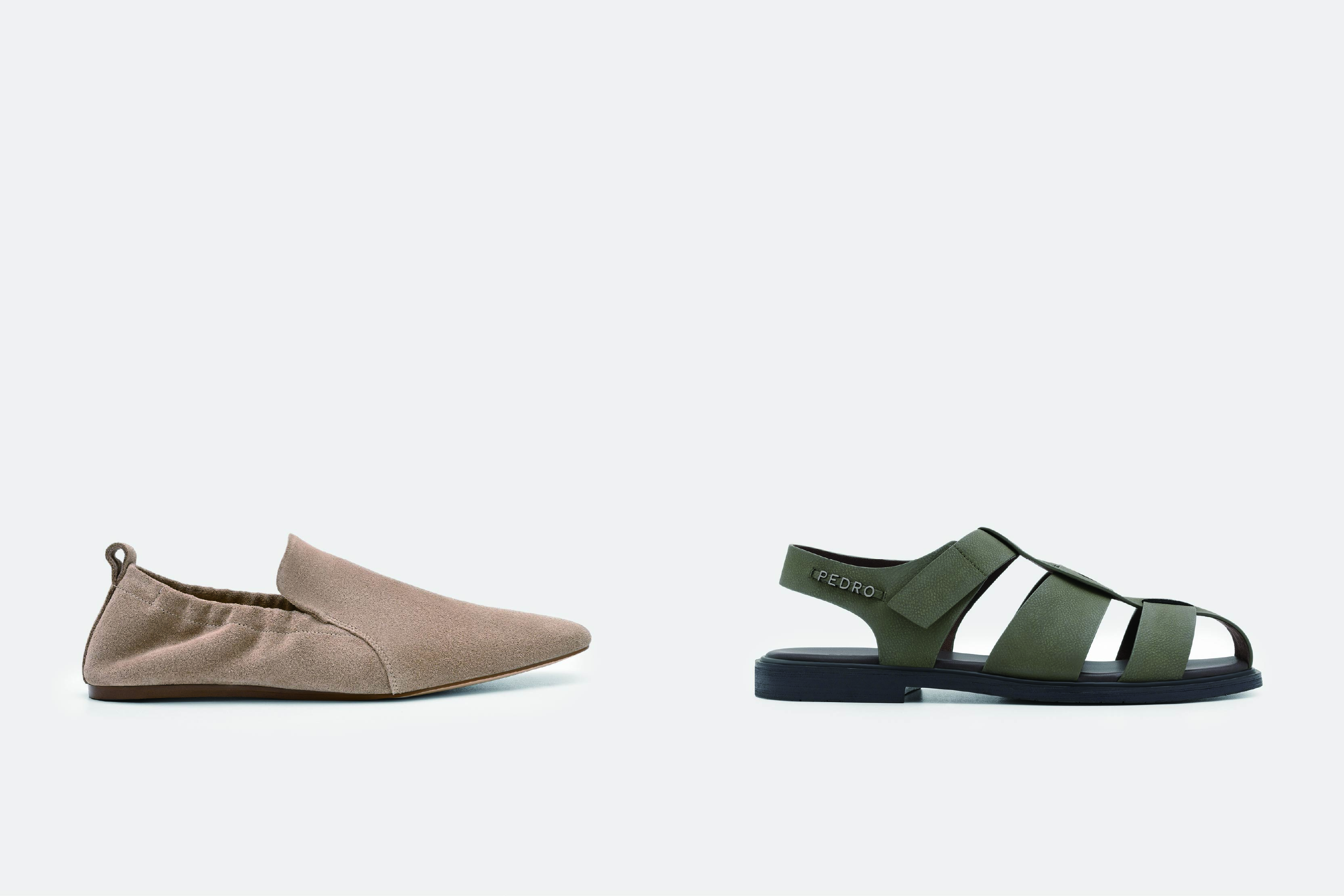 皺皮便鞋(左),羅馬後帶涼鞋 軍綠色(右)。(圖/PEDRO 提供)