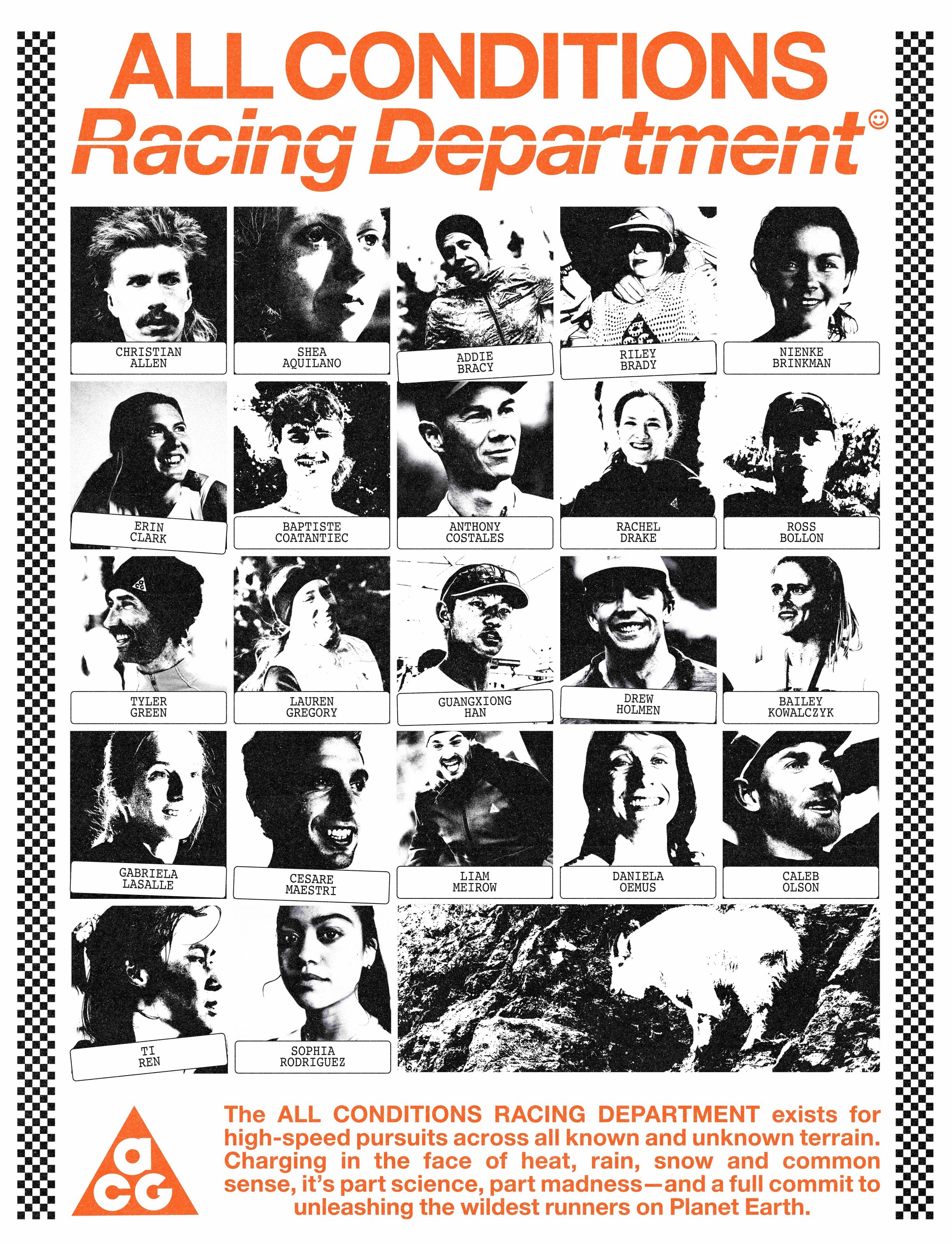 分享本圖除了重塑 ACG 品牌的定位外,還特別組建一支追求突破、勇於挑戰的越野跑者隊伍 All Conditions Racing Department,由 22 位來自世界的頂尖運動員們組建而成,並針對 ACG 原型產品進行實測與反饋,讓裝備達到更高的效能,支持著全世界的運動員們。對此ACG 全球副總裁兼總經理 Scott LeClair 表示,這是 ACG 的重要里程碑,並邀請所有運動員們一同站起來,走出去,盡情探索,去享受接觸自然獨一無二的旅程。