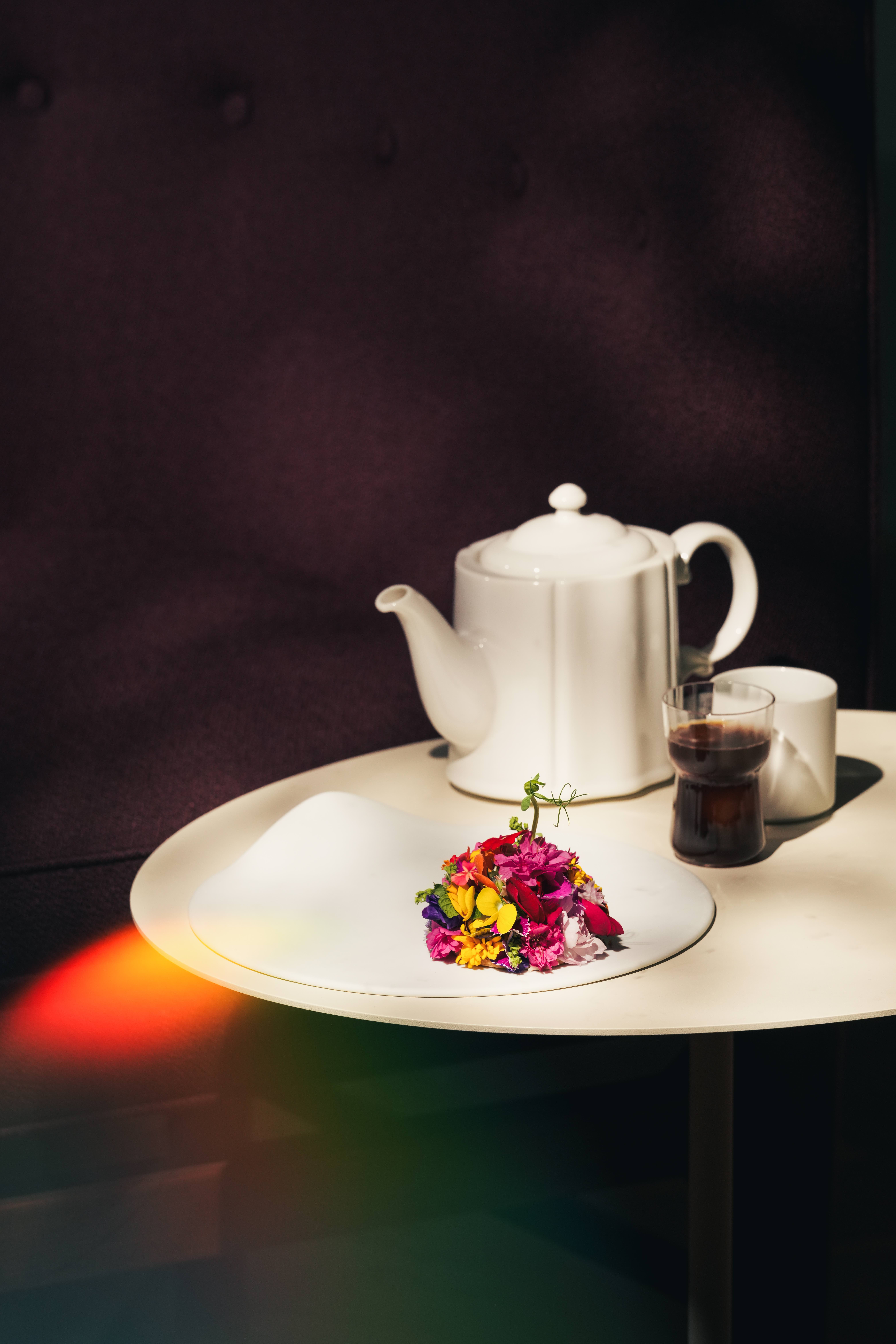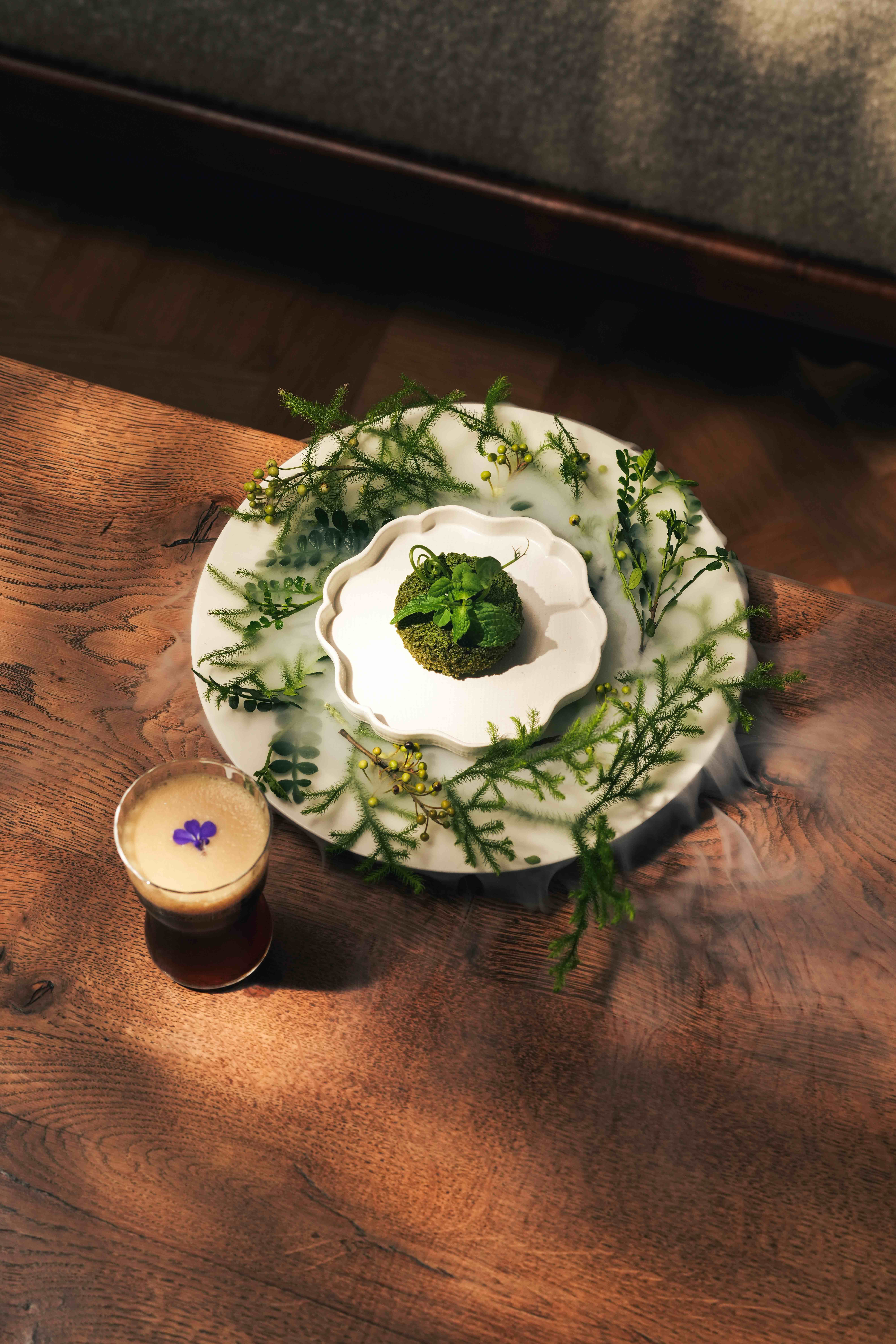 分享本圖而森珀,則是以京都特調搭配上萊姆馬告慕斯、馬鞭草凍、蜜瓜、羅勒甜湯、薑糖,兩者結合在視覺上有如湖中的森林倒影一般,浪漫且自在,京都特調的多層次口感與甜點相互呼應,既沈穩又迷人。最後一個花嶼,使用阿里山壺泡搭配上季節食用花卉、香草豆乳奶油、榛果塔皮,兩者在視覺上特別搭,而茶香又巧妙與奶油豆乳香氣融合,達到視覺與味覺的雙重饗宴。此次的「春時飛花日舞」不僅是一次跨國際、跨領域的交流活動,也是一場結合飲品、素食文化理念的創新,更是帶出永續共生的深層含義,賦予了新的故事。