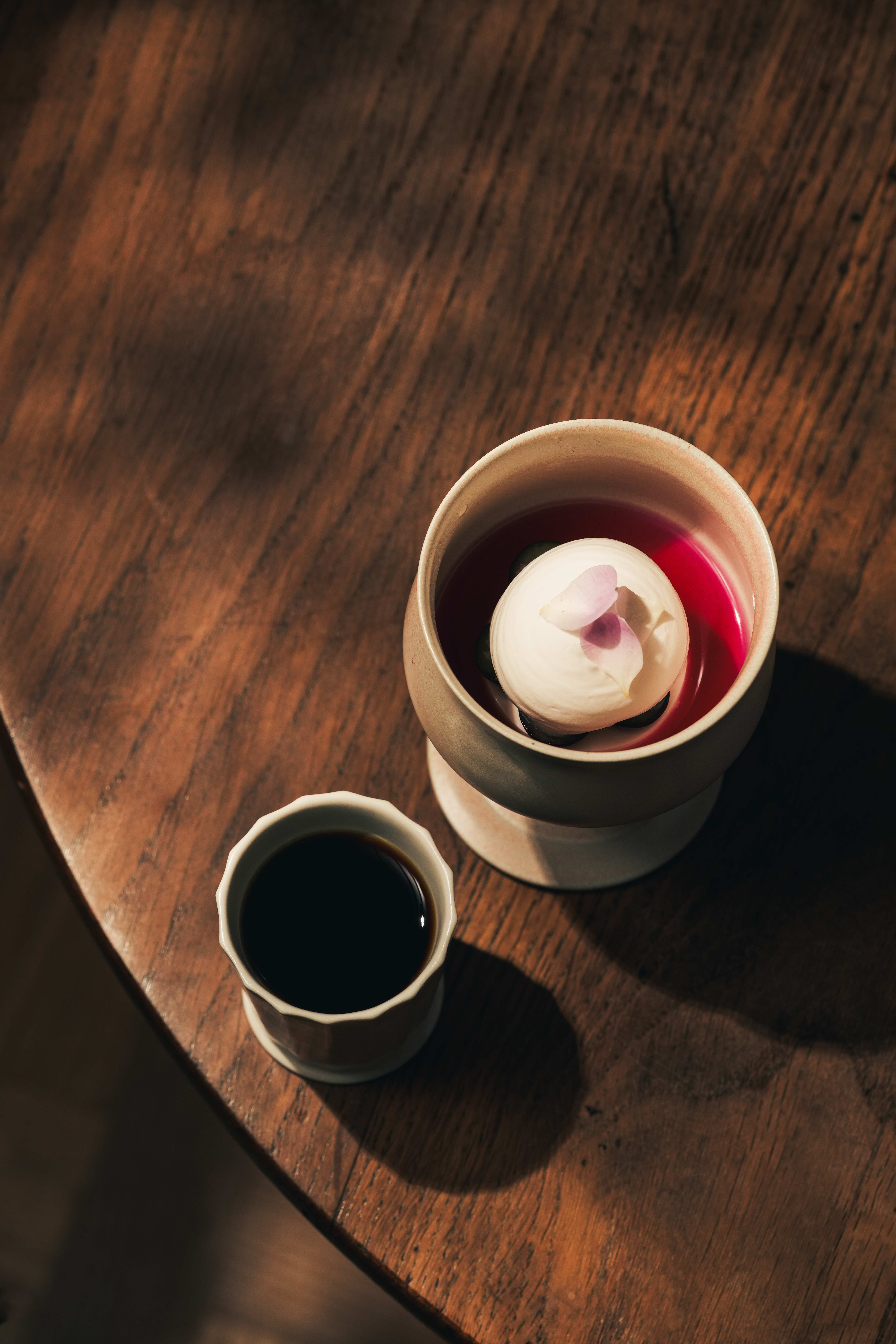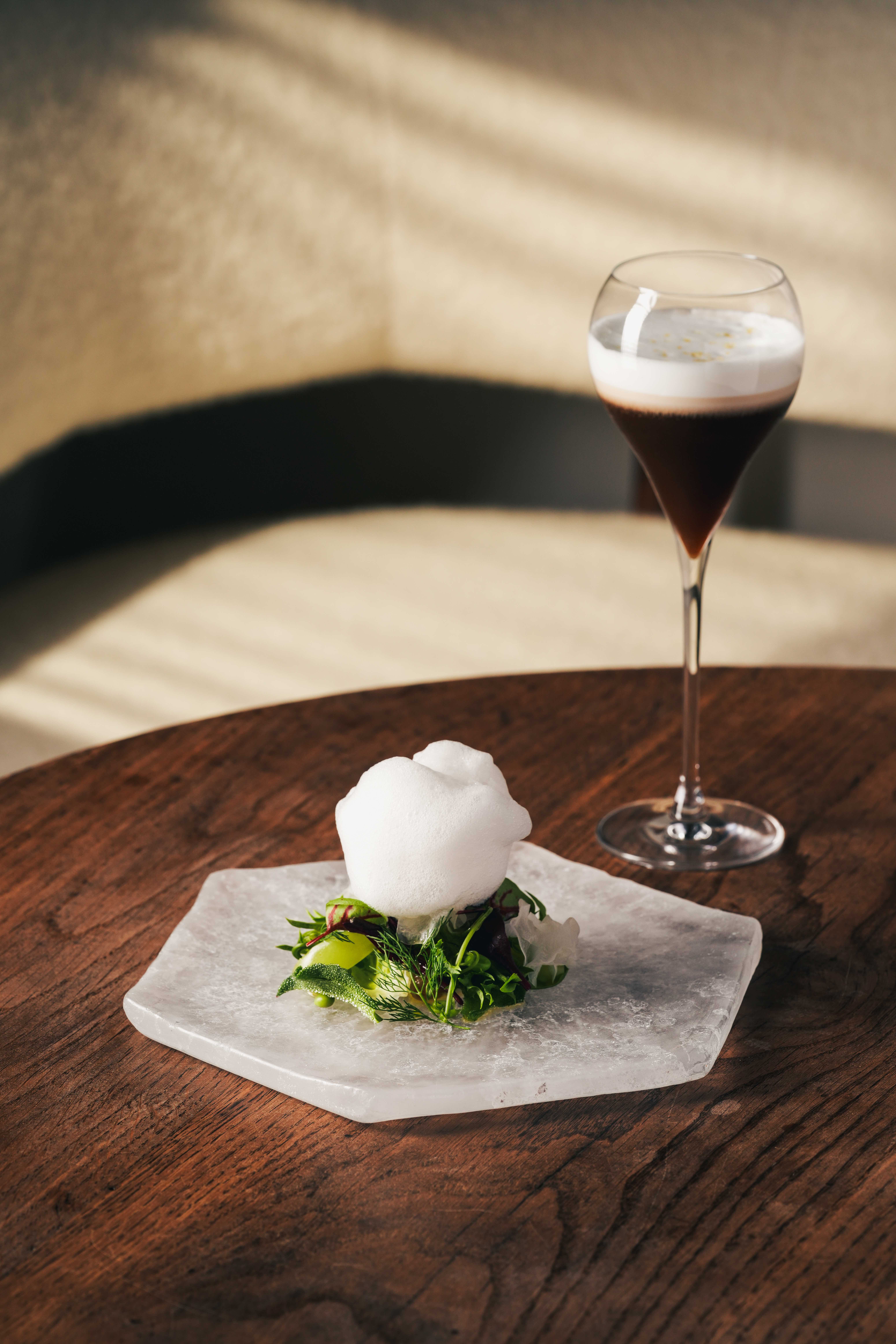 分享本圖另外青息,則是結合台北特調和生菜沙拉、檸檬起士醬、薰衣草泡泡、酸種麵包,台北特調的水果清香與甜點的起司味道相互交融,口感層層遞進。而露霜則是以熱的藝伎咖啡搭配茉莉花茶凍、檸檬玫瑰豆花、檜木甜湯,水果清香的咖啡與茶香堆疊出複雜的風味,其中芭菲更是帶出酸甜特色。