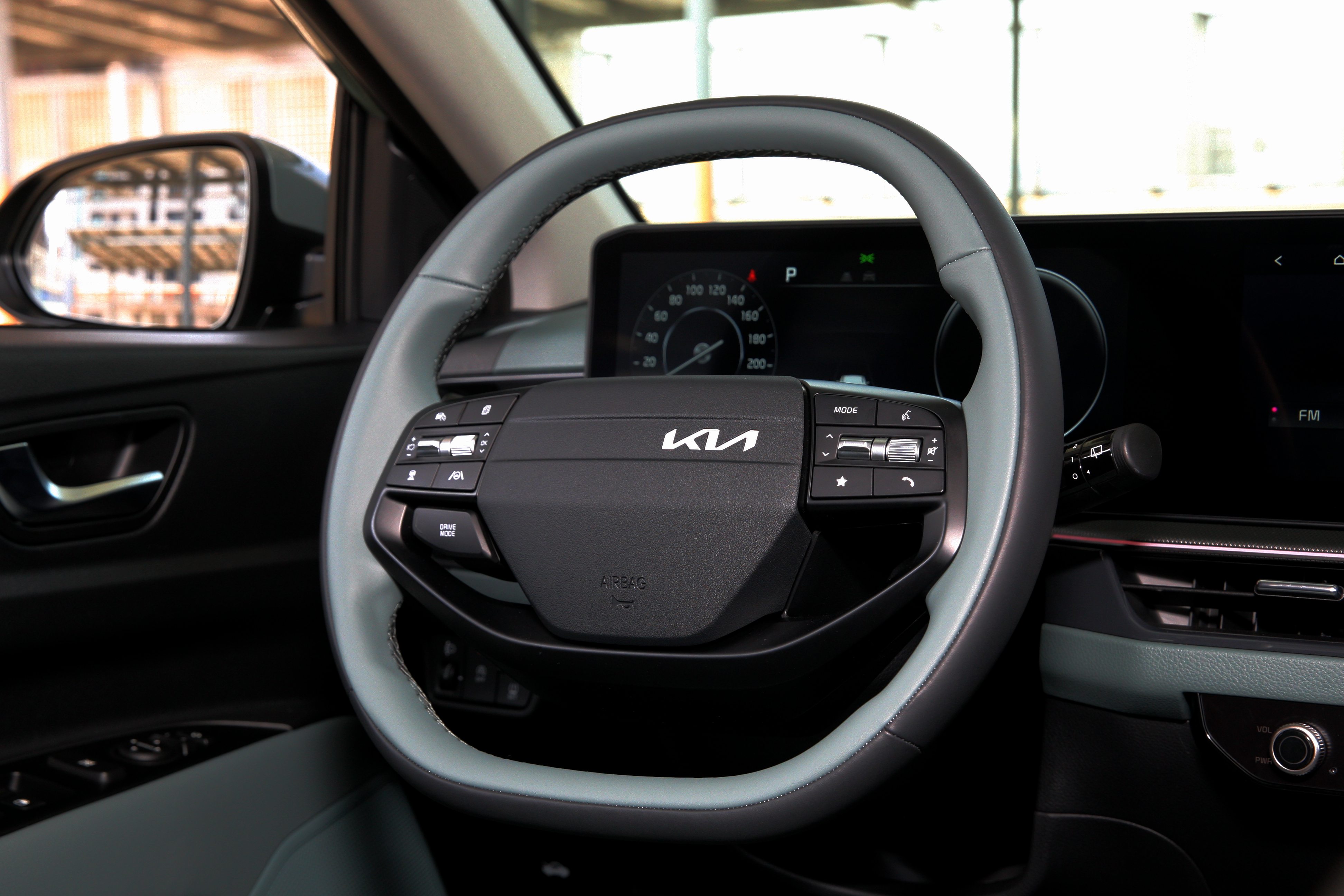 分享本圖比擬旗艦車款 The Kia EV9 的雙幅式多功能方向盤,可輕鬆就手地切換行車駕馭系統,還可連動相對應的氣氛燈變化。 (圖/顧宗濤 攝)