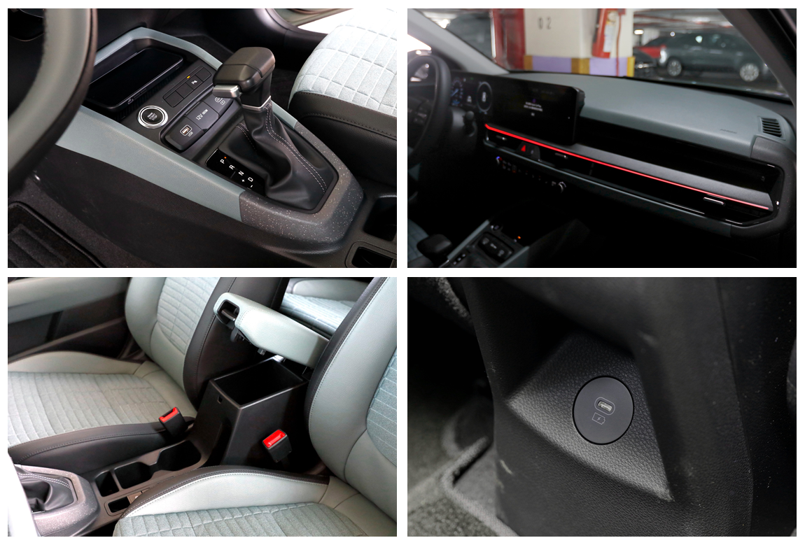The new Stonic 將引擎啟動鍵、USB、Type-C、12V 電源整合在排檔桿座前方;中船則有雙杯座與小置物空間;中央扶手後下方也有一個 Type C 充電孔。而 64 色可調式氣氛燈更是內裝質感的加分配備。(圖/顧宗濤 攝)