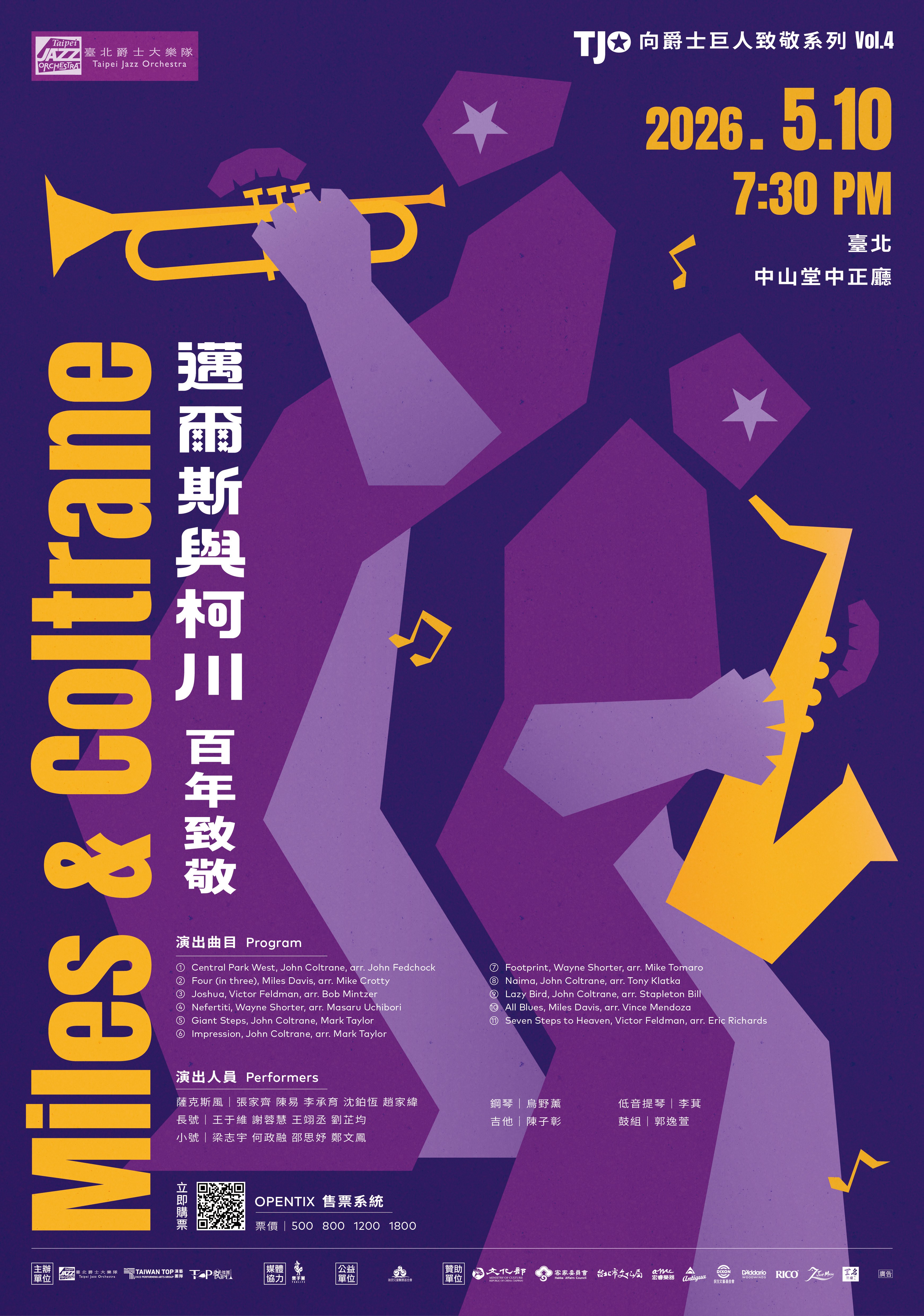 那絕對不能錯過這項資訊,臺北爵士大樂隊將於 2026 年 5 月 10 日的晚間 7 點半在臺北市中山堂中正廳推出音樂會《 TJO 向爵士巨人致敬系列 4- 邁爾斯與柯川百年致敬》,透過氣勢滂薄的爵士樂曲,邀請觀眾們一同穿越回 1950 年代,感受 20 世紀兩位最重要的爵士音樂家邁爾斯・戴維斯(Miles Davis)與約翰・柯川(John Coltrane)的多首經典之作!
