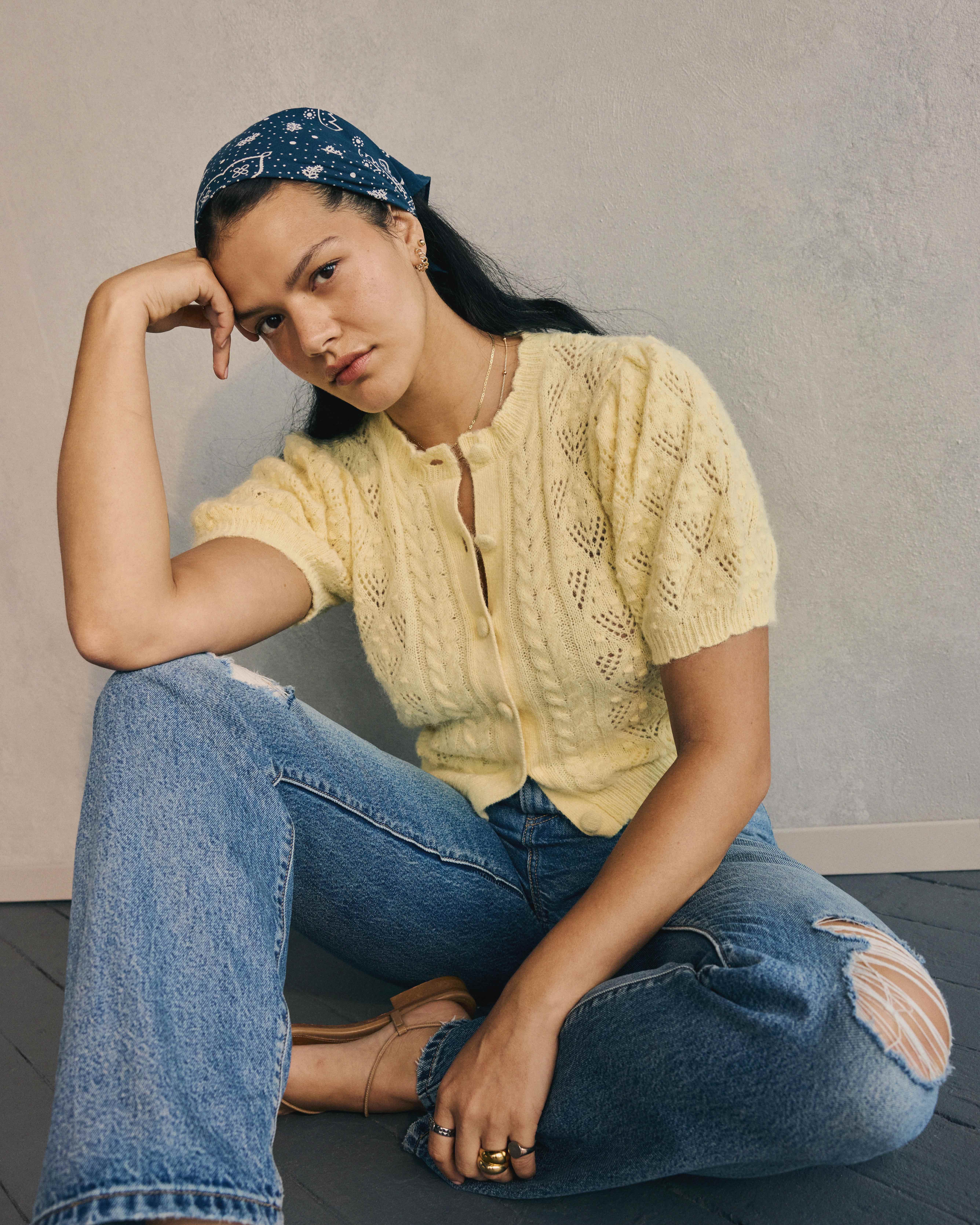 分享本圖在女裝系列則以 Easy Dad 寬鬆直筒丹寧褲作為系列核心,透過廓型比例、刷破與褲腳鬚邊細節,展現出年代的復古感,此次還特別採用寬鬆的剪裁,並在小腿處順著腿型狀收緊,讓穿搭者完美的展現出腿部線條。上半身還可以穿上針織開襟短袖上衣,不僅展現美式風格,還帶出獨特的個性風,並同時洋溢著春日的活潑暖意。