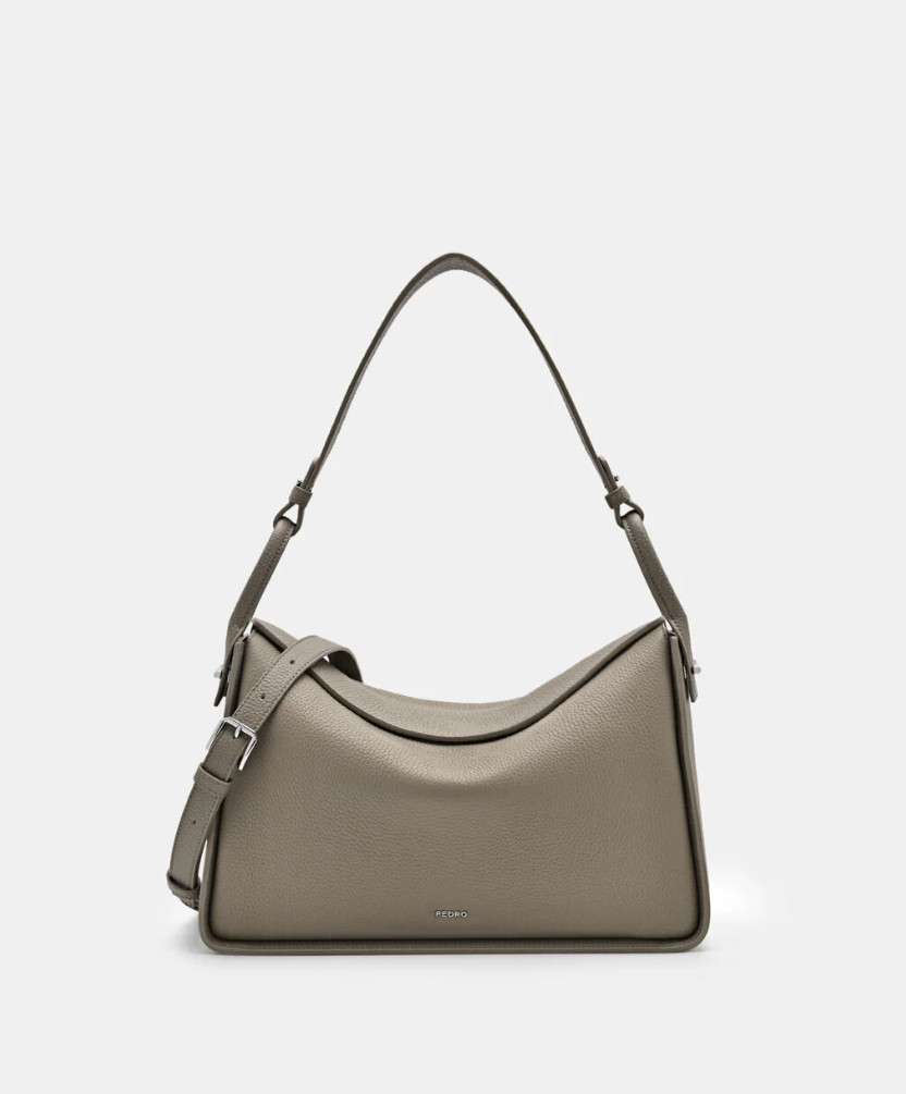 分享本圖首先是包包的部分,第一款是這個淺褐灰色的皮革肩背包,採用光滑小牛皮打造,整體輪廓圓潤,看起來簡約又有質感,再搭配上冷色調的五金作點綴,在低調中展現出內斂的質感。