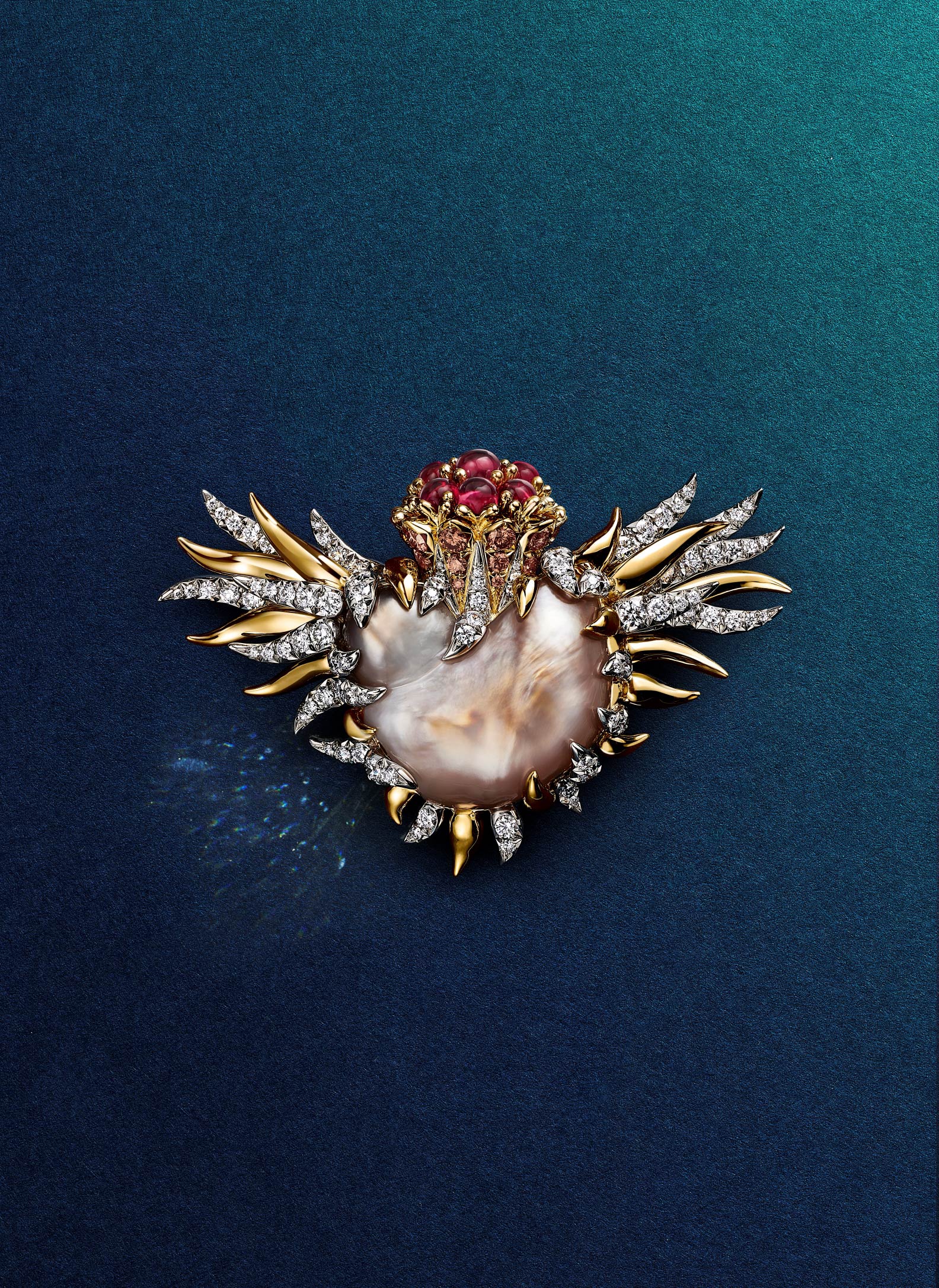 分享本圖這系列也同步推出一款獨一無二的珍珠石上鳥胸針,它的靈感源自 Schlumberger 於二十世紀中期創作的典藏胸針設計。新作保留了原作標誌性的 18K 黃金「火焰」元素,並以一顆極為稀有、重量超過 36 克拉的淡橙棕與白色巴洛克天然珍珠作為心形主體。因為珍珠的形態獨特,所以工匠特別研發高難度鑲嵌的結構以確保可以穩固定位。在 18K 黃金與鉑金結構上再點綴蛋面切割紅碧璽,與巴洛克珍珠的色澤相互輝映,層次分明。