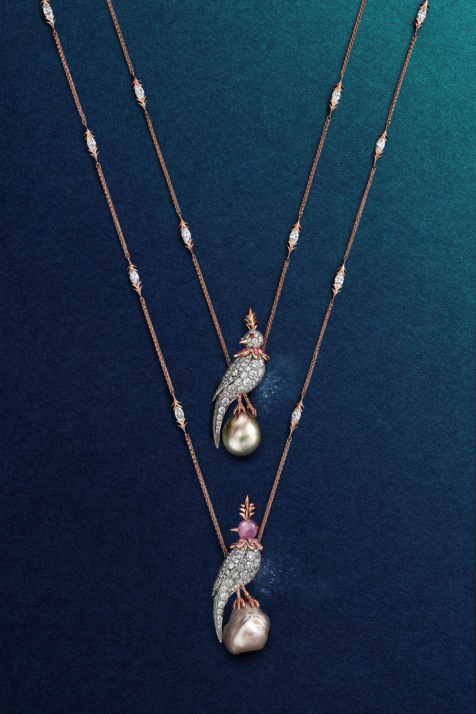 這枚珍珠石上鳥高級珠寶膠囊系列胸針,以鋪鑲鑽石的小鳥搭配星光藍寶石鳥首,棲息在一顆重超過 18 克拉的白色巴洛克天然海水珍珠上,以及另一件珍珠石上鳥高級珠寶膠囊系列鏈墜,則是系列中尺寸最大的珍珠之一,一顆重超過 29 克拉的棕灰色巴洛克天然海水珍珠,被巧妙運用在吊墜設計中。再次展現了 Tiffany 卓越的工藝。