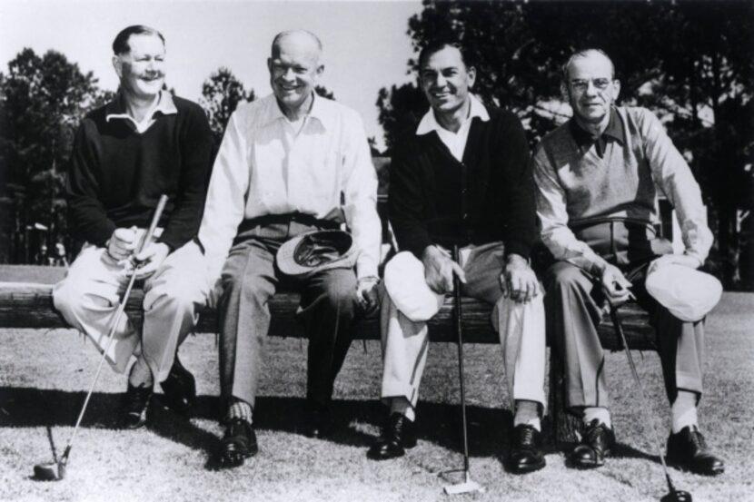 美國名人賽說是高爾夫運動的最高殿堂之一並不為過,它的傳統經典與政治、文化的交集密不可分,這張照片約為1950年代拍攝,由左至右分別為:高爾夫傳奇球星拜倫·尼爾森(Byron Nelson)、時任美國總統德懷特·D·艾森豪(Dwight D. Eisenhower)、傳奇球星班·侯根(Ben Hogan),也是冠軍晚宴的創始者,以及奧古斯塔國家高爾夫球俱樂部主席克利福德·羅伯茨(Clifford Roberts)。(圖/wikipedia.org)