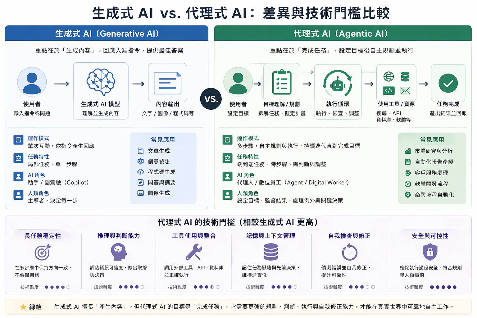 生成式 AI 讓人們看見機器能夠理解與表達,而代理式 AI 則進一步推動這種能力進入行動層面。關鍵不在於輸出是否流暢,而在於任務是否能被完成。